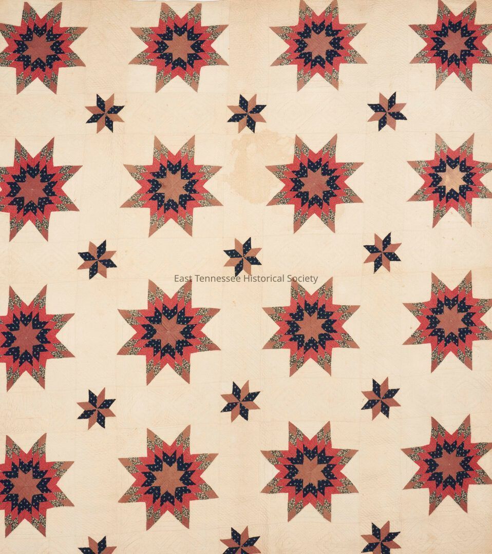 East Tennessee, Roane County, hand pieced quilt, Blazing Star variant pattern, by America Waller Goodwin (1835-1893), rendered with all cotton fabric in predominant colors of brown, red, blue, and green on a white ground. Consisting of 14 1/2 blocks set 4 x 4, separated by 5 1/2" sashing and 8-point star corner blocks, and no outer borders. Heavily quilted in diagonal and straight lines of varying widths creating a secondary pattern with diamond designs in the sashing. Back with machine embroidered label and printed photo of maker reading "Made by America Waller Goodwin 1835-1893). 73" W x 81" L. 4th Qtr. 19th century. Note: Additional documentation, including copies of an appraisal by Rebecca Harris circa 1994 and Quilts of Tennessee Survey Form available with the purchase of this lot.Collection