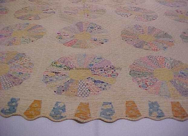 Quilt made by Florence Day McKamey, "Dresden Plate" (aka. China Plate) pattern. Segments are made from dress cotton fabrics, multicolor with yellow centers. Plates are set against a white background. Border made by alternating blue and yellow segments, with white pieces of fabric in between. Edges are scalloped. Backing is white; binding is back to front. Quilting follows the outline of each segments, and is diamond patterned on background. 1930s-1940s.