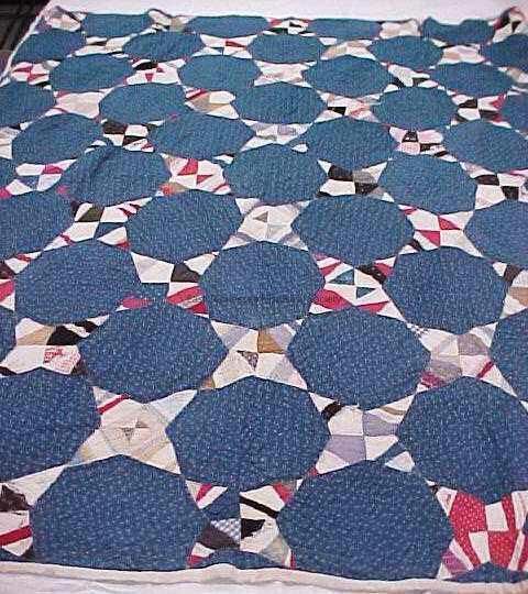Quilt in a string star pattern made by Elizabeth Shields, "1915" embroidered in white on the diagonal in one corner, palette of blue prints, maroon, gray, red, stripes, and gingham check; blue-and-white print was popular for women's shirt-waist dress, long sleeves and long skirts, one of gray fabrics appears to be linen (hand woven?) perhaps tow from making sacks; black fabric is mourning cloth pieced by hand, quilted by hand with coarse boss ball thread (purchased, sold commercially, not expensive); muslin backing with machine stitching at the center; binding by hand, back-to-front.; cotton batting; appears to have been used and washed, 72"l x 58"w.