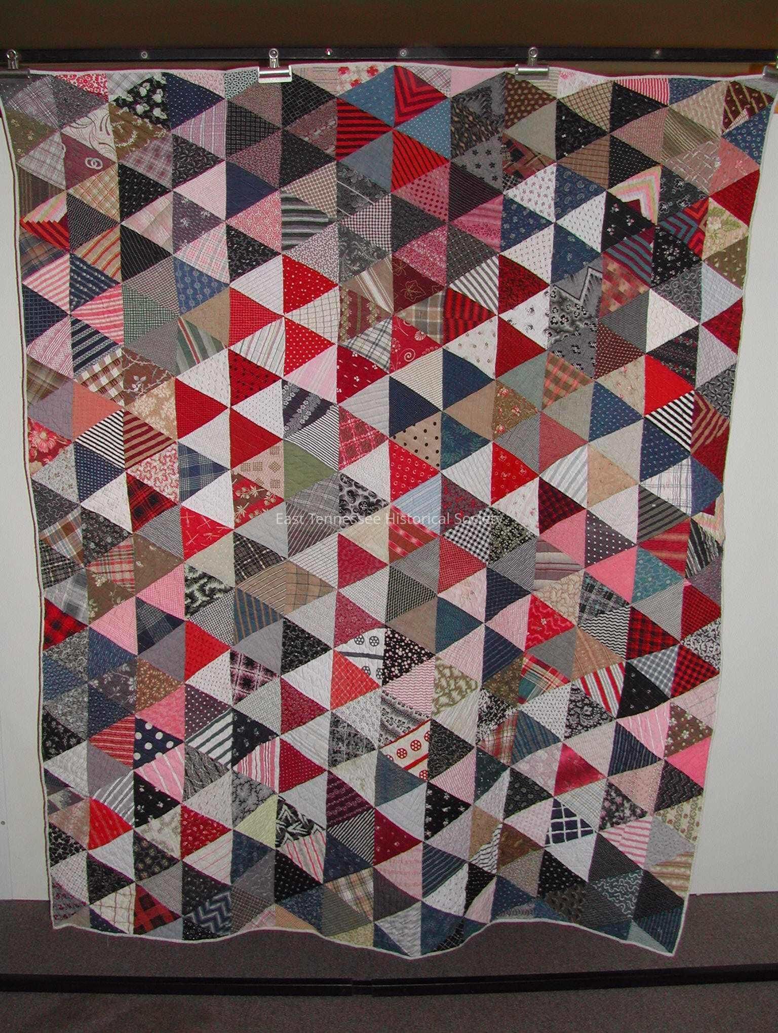 Quilt by unknown maker, "Triangle Charm"* or "Odd Fellows"** pattern (pattern is all triangles, made from various print fabrics predominately in blue, red, black, burgundy, brown, with no two of the same fabric), cotton, handsewn, parallel lines of quilting on the diagonal, 7 stitches/inch with white cotton thread, binding is back to front, backing composed of two panels (31", 33-1/2") of gauzy material (muslin), cotton batting, no border, square corner, Washington County, c. 1900.