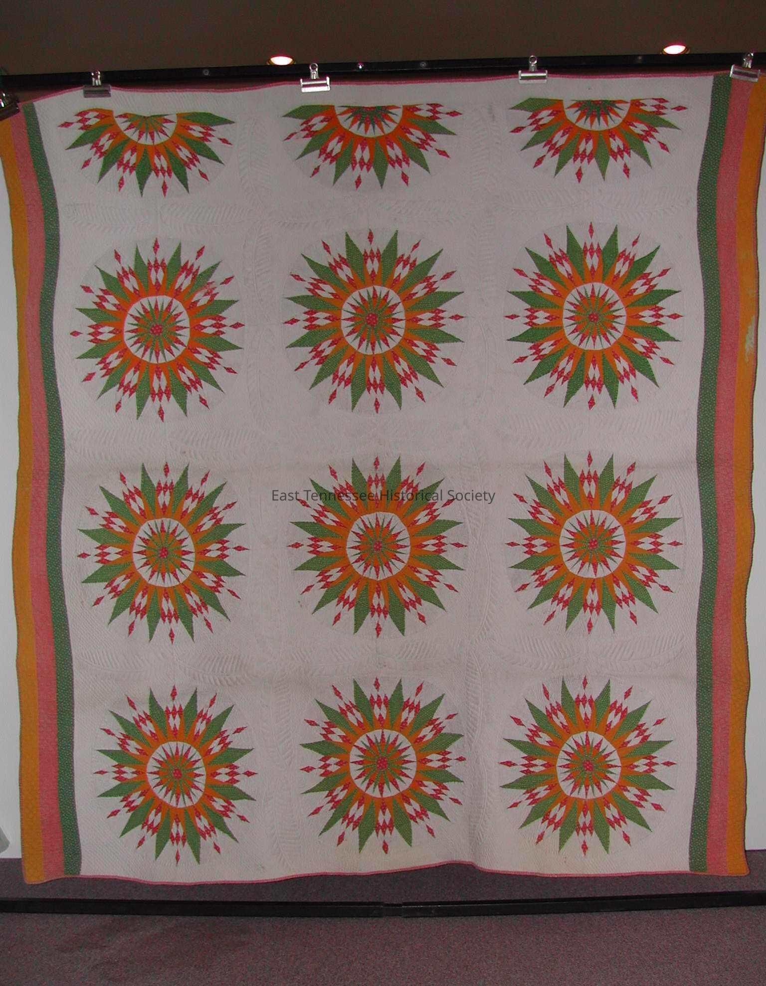 Appliqued quilt attributed to "Grandmother Coward," Mariner's Compass pattern, pieced by the block, handsewn, green, pink, gold and cream cotton fabric, nine borders + three half cotton borders with cross hatching, quilted by the piece in parallel plumes, 7 stitches/inch with cotton thread, stuffed plume sashing, applied binding, cotton backing, cotton batting, c. 1850.Collection