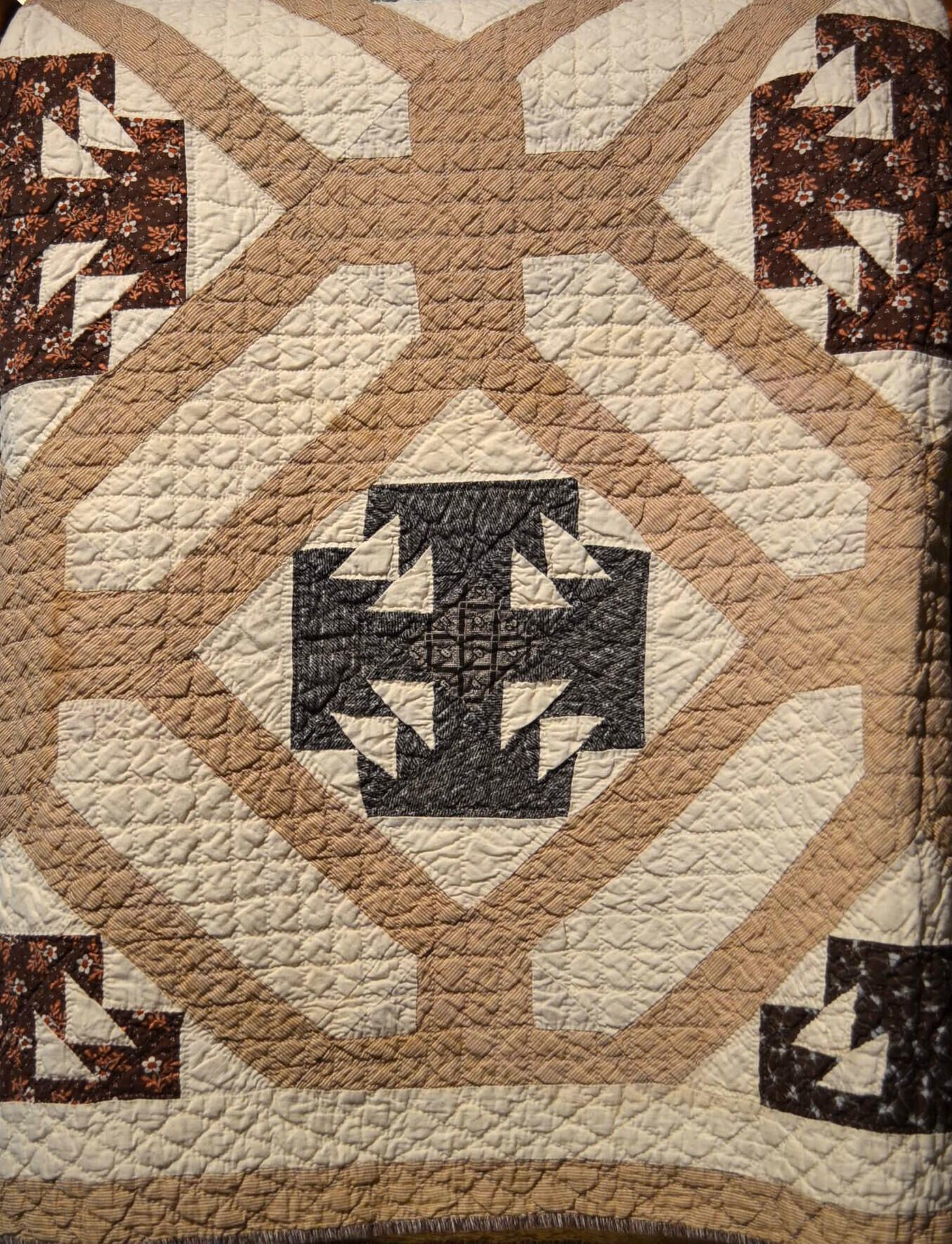 Quilt in "Sawtooth T in a Garden Maze" pattern attributed to Lucinda McLin Carson, worked in grays/browns/blacks/maroons/lavender (one square), pieced squares with one square at center are mix of small floral prints and geometircs, rest are triangles in two sizes, set together wtih white cotton, garden maze formed in light-brown pinstripe, cream muslin backing, bound in two fabrics--maroon and white stripe and light-brown pinstripe (garden maze fabric), 86"h x 66"w, c. 1890.Collection
