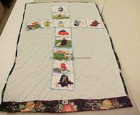 Quilt made by Mary Dowell of Knoxville, features the 12 apostles appliqued onto 12 individual squares and squares sewn in form of cross (eight down and five across) onto small quilt, light blue background quilted in diamonds with white thread, black floral border, backing is white and pieced along long sides, signed "M. Dowell 1993" at lower left, some black thread shows through, crude stitching overall, 47"l x 15"w, 1993.Collection