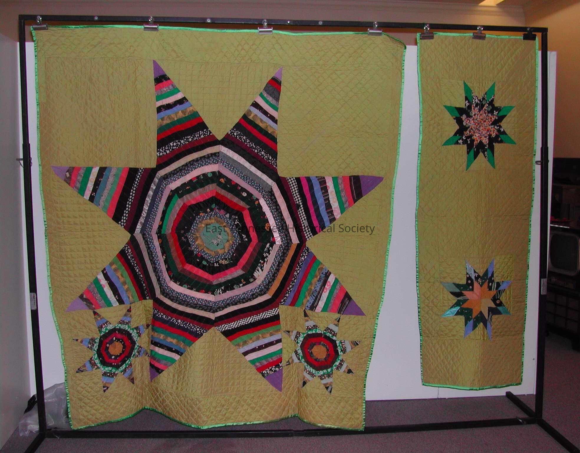 a) Quilt is string pieced, probably with newspaper underneath, large central 8-pointed multi-colored star (68' x 68"), with two smaller ones in two corners, all synthetic fabric--rayon, as from women's dresses and possibly ties, background is pea-green polished cotton, green satin "boudoir" backing (fabric was used in upscale bedrooms in the 1920s-1930s), color choice is unusual as 1930s is usually associated with soft colors/pastels, reversible, handsewn, 5 stitches/inch with yellow cotton thread, quilting is parallel lines by block and straight grid in background, 6" and 2" borders with cross hatching, stitching is somewhat crude, binding is back to front, square corner, 1936.