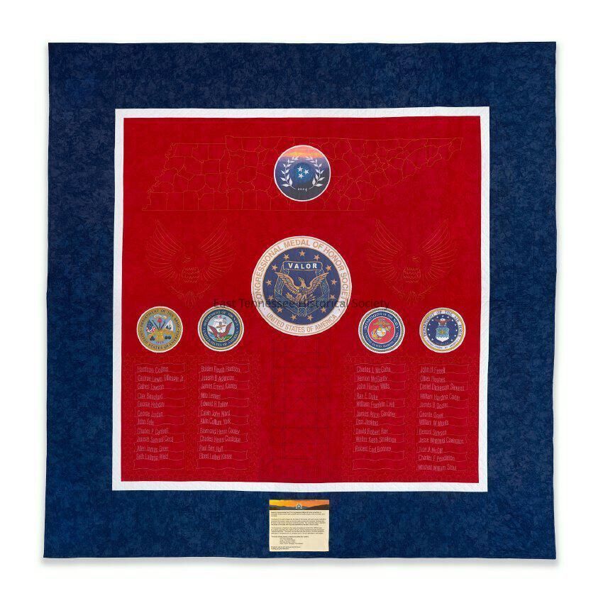 a) Banner quilt for Congressional Medal of Honor Convention (Knoxville), design topped by map of Tennessee with each county outlined, convention logo at center, star for Knoxville in Knox County, Sunsphere at base of CMOHS seal, four pillars hold emblems of each service represent East Tennessee Veterans Memorial, pillars inscribed with names of 32 Medal of Honor recipients from Tennessee and 12 born in Tennessee but attributed to other states, motto of each branch of service in border [top - Above All (Air Force), right - This We'll Defend (Army), left - Semper Fidelis (Marines), bottom - Honor, Courage, Commitment (Navy)] with dogwoods, eagle on either side of CMOHS logo, designed/pieced/appliques by Kit Brown, quilted by Cyndi Hermann, 83"h x 82"w, 2014.