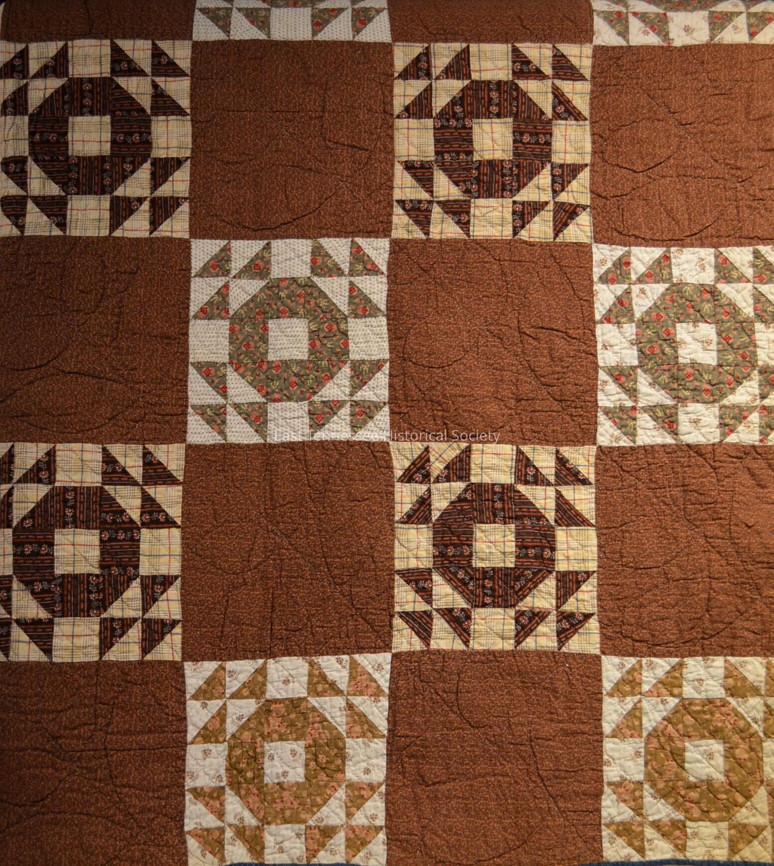 Quilt in "Wedding Ring"* pattern attributed to Martha E. Carson, Lucinda McLin Carson or Sophia Caroline McLin, alternate solid and pieced squares, nine squares high/eight squares wide, top and bottom rows identical pieced squares--light brown print with peach rounded forms dotted with red/light-brown floral spray/white background, dark-brown calico geometric with tones of brown/yellow/red used in between, pieced squares use two fabrics--floral with floral geometric, four different colored squares repeat through quilt each having touch of red, natural muslin with very small floral backing, medium-blue and white binding, quilted on diagonal in floral pattern, 85"h x 74"w, c. 1880-1890 (*pattern name and date per quilt historian Merikay Waldvogel)