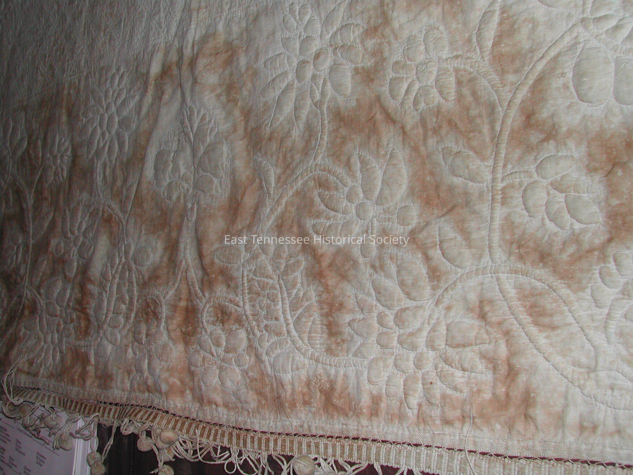White wholecloth quilt of Catherine ("Bonny Kate") Sherrill Sevier, 45" center medallion, handsewn, stuffing/vines stuffed with cording, white cotton fabric, tape binding, coarse cotton backing, ball fringe all around, hand quilted, quilted medallion--arches, oval, rondelle, swags, cross hatching/double quilting in background, border quilted in winding vine with flowers, 8 stitches/inch with cotton thread, rounded corners, first quarter of 19th century/c. 1820.