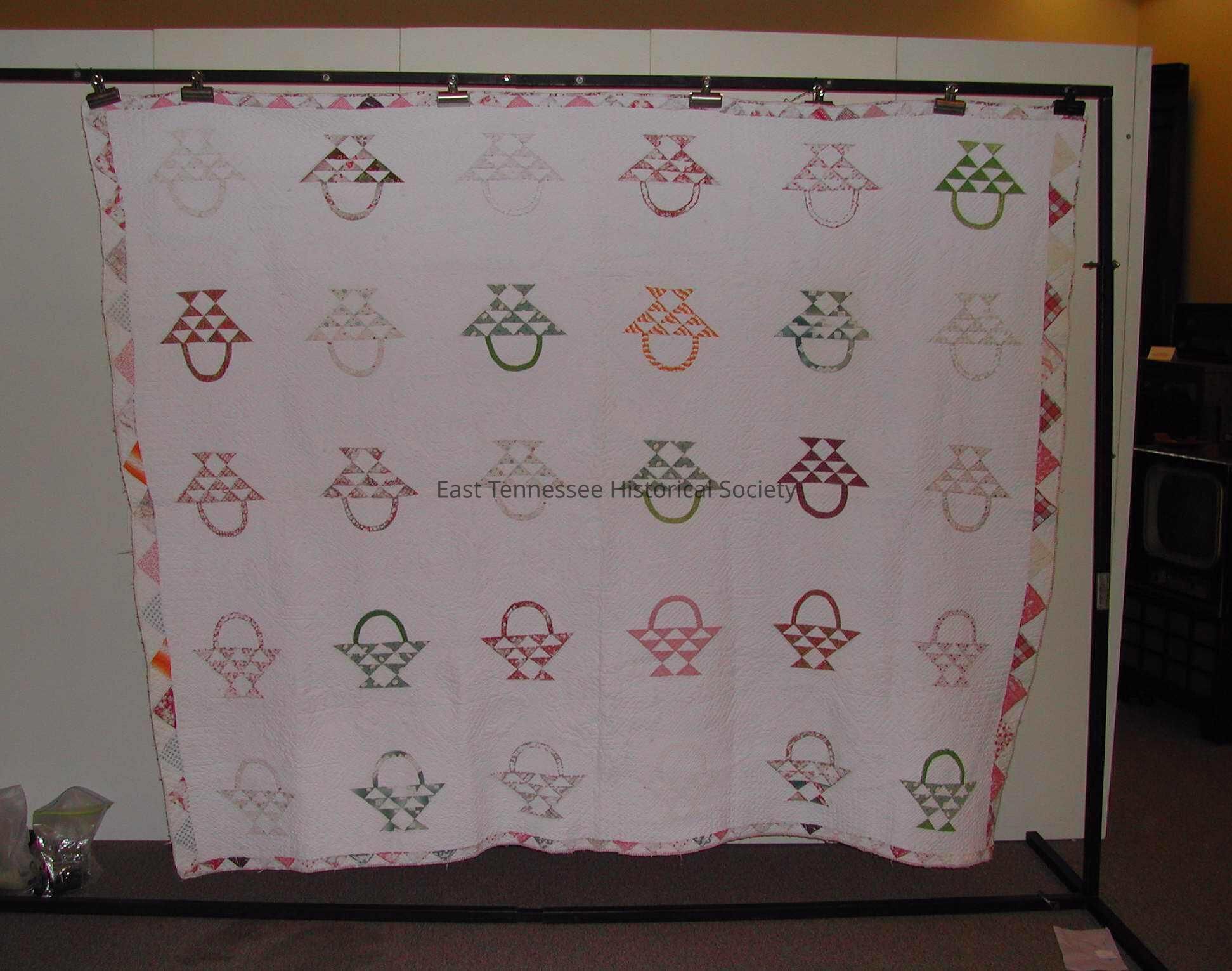 Quilt, "Pieced Basket" pattern, pieced by the blocks, 30 9.5" blocks, handsewn, 2.5" dogtooth border, white with multi-color cotton baskets, cotton binding, muslin backing, 10 stitches/inch with white cotton thread, cotton batting, quilted by the block and in the background in grids and parallel lines, quilted in plain blocks with basket design with names on some and clamshells, parallel lines in border, rounded corners, fabrics c. 1850.