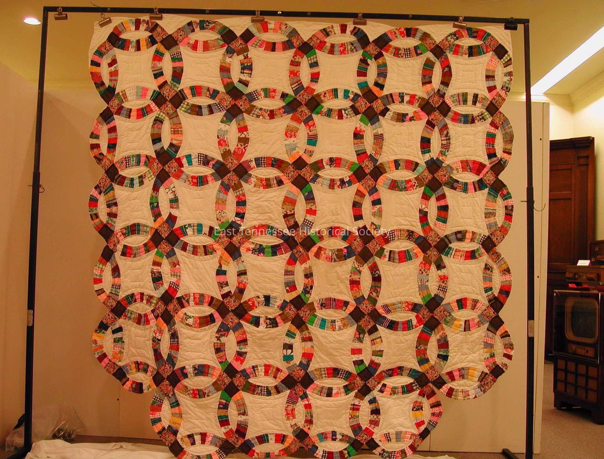 Quilt, Double Wedding Ring pattern, hand and machine construction, "1989 / M. DOWELL" [Mary Dowell] embroidered on back corner/"Murti Wright" in ink, rings made from variety of cotton and poly cotton print fabrics dating over 40-50 years, browns and rust sets, off-white background, quilted in white poly cotton thread wtih large stitches (5/inch), knife-edge binding, no borders, scalloped corners (scallops filled on top edge to create straight line/extra rings [4] on bottom to form scallops/scallops on edge), poly cotton backing, cotton poly thread, poly batting.Collection