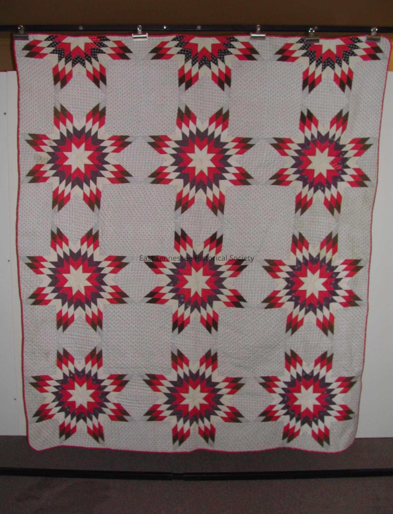Quilt made by Mary Ann Rogers Maupin, star pattern, pieced by the block, nine full 24" blocks and three half blocks set in, handsewn, cotton fabrics--double pinks and purples/black and white shirting/brown (solid and print diamond pieces), binding applied straight, muslin backing, 7 stitches/inch with cotton thread, cotton batting, quilted by the block 1/4" from seam, quilted grid in background, Claiborne County, 81"l x 69"w, c.1880s.Collection