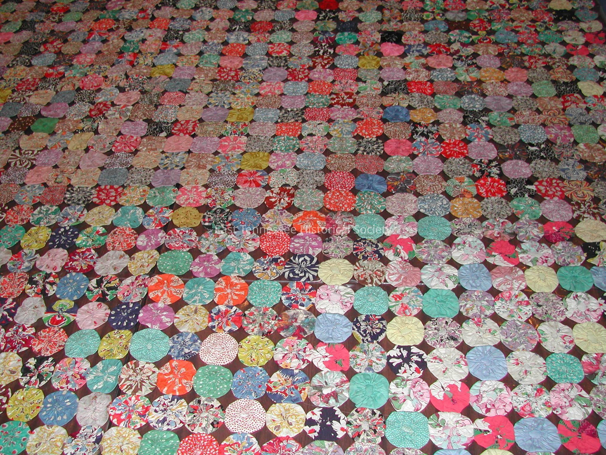 Quilt made by Mary Nicely Fielden, yo-yo pattern, 2"-wide yo-yo, handsewn, multi cotton fabrics, cotton thread, unquilted, 1800 total pieces, 89"h x 68"w, c.1952.Collection