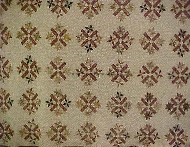 Quilt, "Crosses and Stars, "very large, very good workmanship with the points, good quilting, cotton fabric, brown, tan, pink, navy, teal, and gold, cotton thread, muslin (coarse weave) backing, cotton batting, applied bias binding, clam shell plain block design, 10 set on point block, rounded corner, constructed by hand, 6 stiches per inch, straight line quilting in pieced blocks, from the Knoxville area (per Lee Fitch, Antiques Inc.), very unusual*, worn condition, second quarter 19th century*.