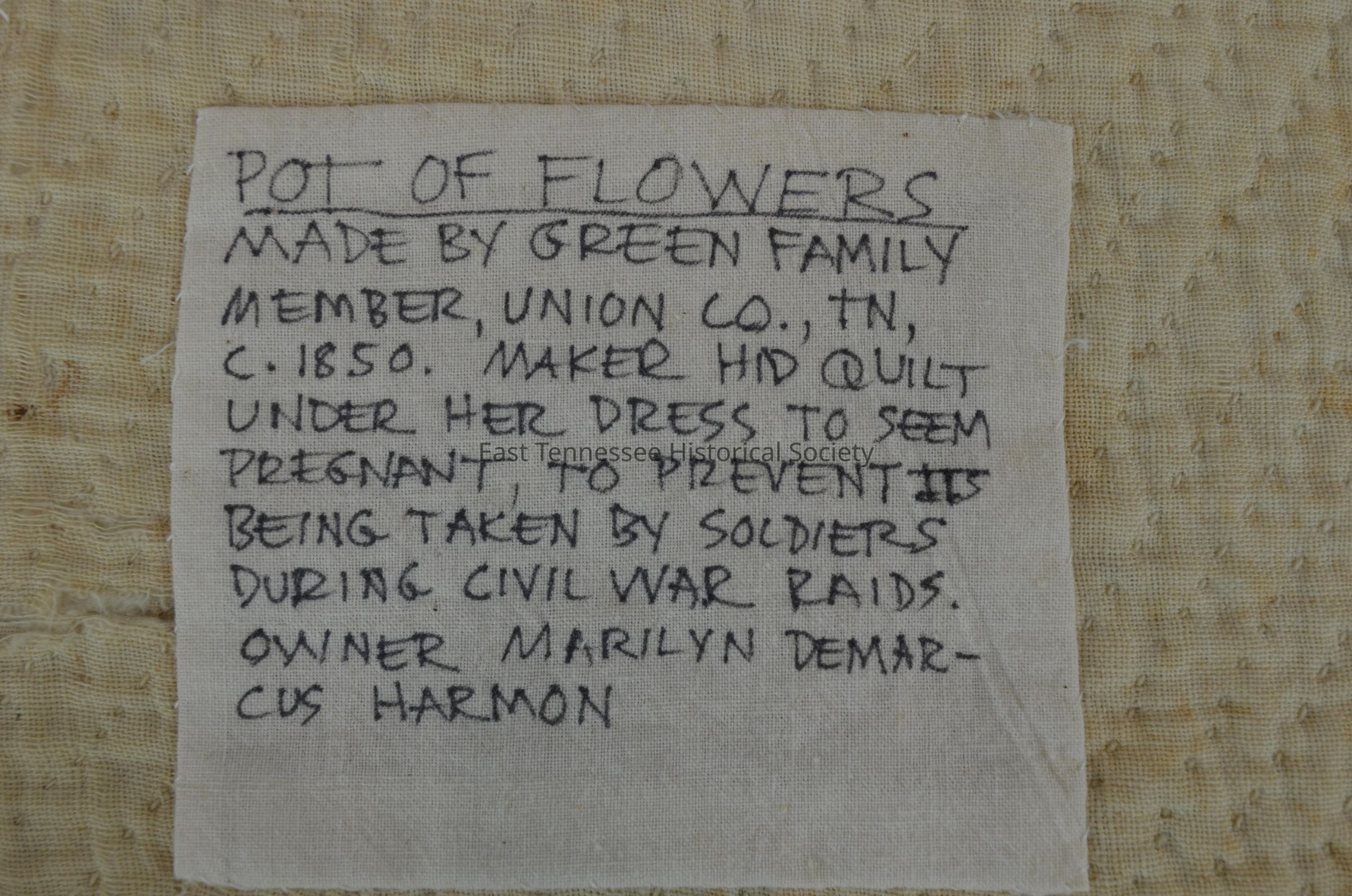 Pots of flowers quilt believed made by Mary Jane Spangler Green, homemade pattern/not traditional, handsewn, cotton, six panels with white background, each contains a pot of red flowers with yellow centers and green stems and leaves, three of the six have red pots with three yellow stripes and seven yellow (green faded to yellow) dots, the other six pots have two yellow stars and seven yellow dots, border on three sides with green zig-zag stem-leaf pattern with red-and-green buds (the border pattern on one side is simpler than on the other two), yellow binding, addition of Stabiltex on weak area, white fabric backing, contemporary cloth tag attached to lower left back corner and reads "Pot of Flowers Made by Green family member, Union County, TN, c. 1850. Maker hid quilt under her dress to seem pregnant, to prevent its being taken by soldiers during Civil War raids. Owner Marilyn DeMarcus Harmon."Collection