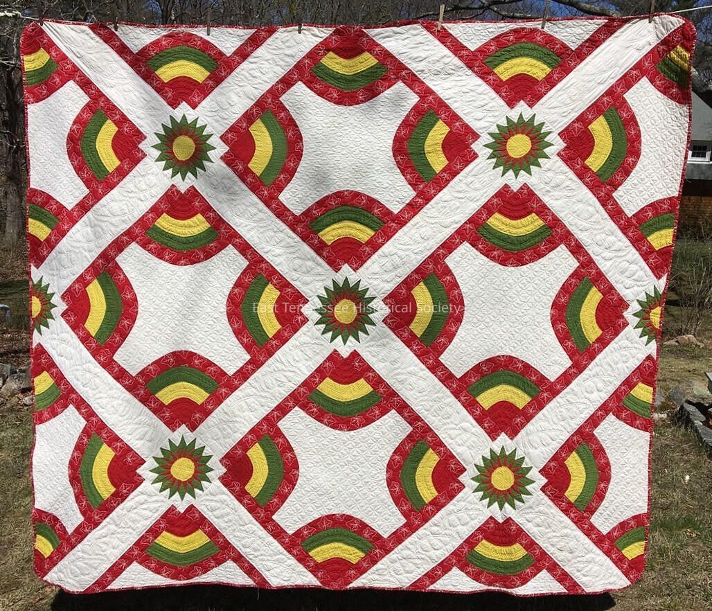 Quilt made by Kitzmiller or DeVault family, "Rocky Road" variation with center star/flower in green/yellow/red with ivy, large square of print red and white/solid red/yellow and green tiny prints in arcs at each corner, part of binding only basted in place. white ground, center machine and hand quilted, 88" x 77", 1890-1910.