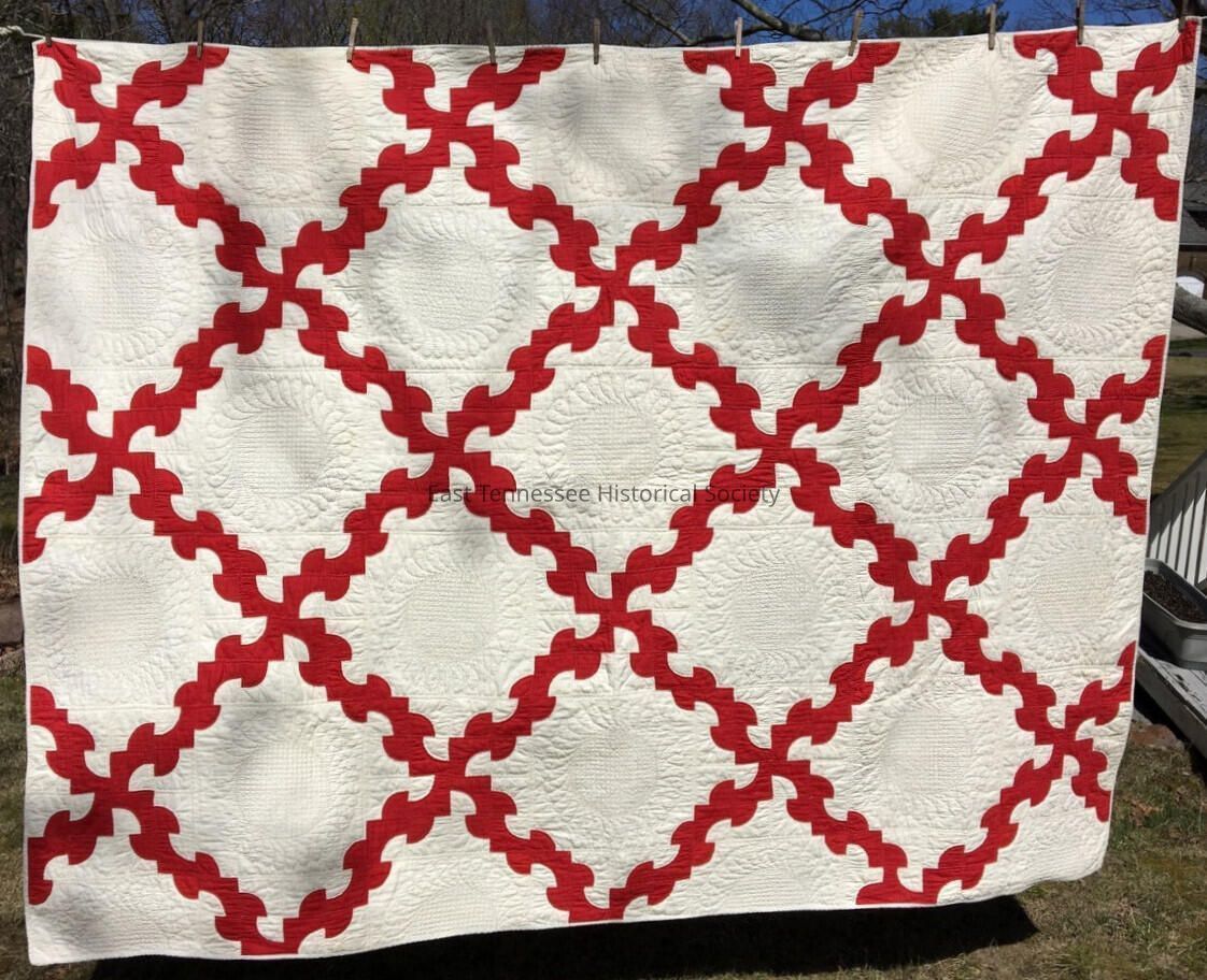 Quilt made by Kitzmiller or DeVault family in "Drunkard's Path" pattern, red with ivy/white, 93 1/2"h x 72 1/2"w.