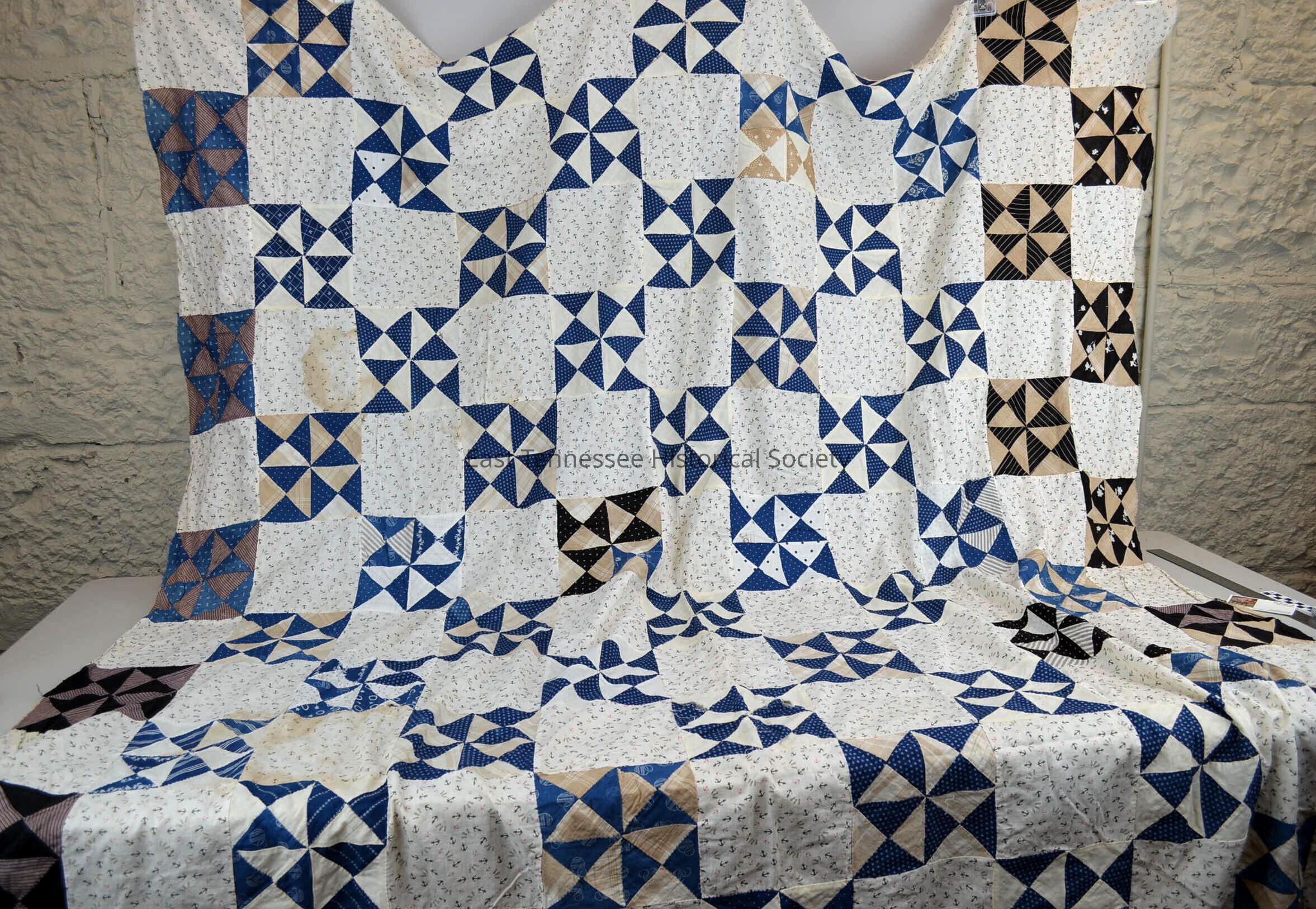 Quilt top made by Mary Elizabeth Scott McConnell, unknown pinwheel pattern in dark blue/brown/white with some of the later printed with sporting motifs (brown and red anchors, bundles of three boat bumpers?), pieced blocks, loose-weave fabric used in at least five squares raveled at seams, hand sewn, 75"h x 69"w, 1910s.Collection