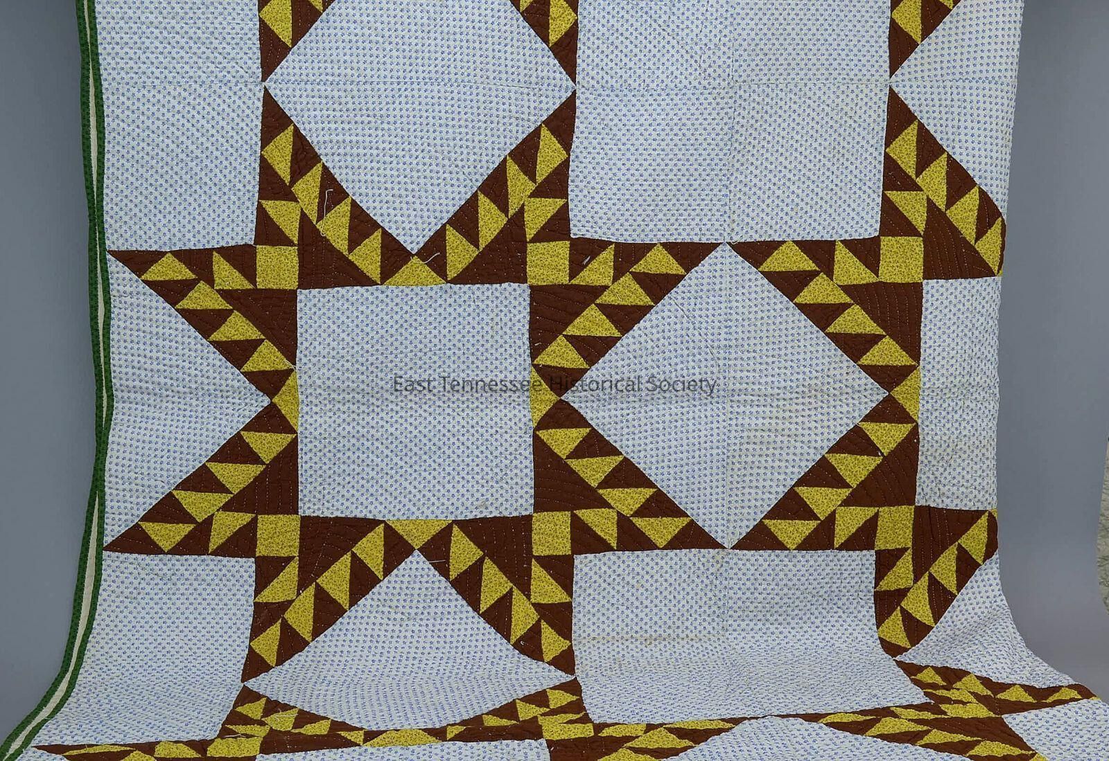 Quilt in variation of Tumbling Star pattern made by Mary Ann Rogers Maupin, stars of yellow-with-brown mini print and solid-brown fabrics for pieced sections, background in blue-and-white mini floral print, edged with green-and-blue print on two sides, kelly green mini print binding, courser off-white muslin backing from flour or grain sacks/written words apparent [one section reading "Mauphin V Rodgers/ Speedwell/ Wheelers*], flannel lining, course thread used, lightweight/summer, hand pieced and hand quilted, 87"l x 83"w, prior to Nov. 1888.