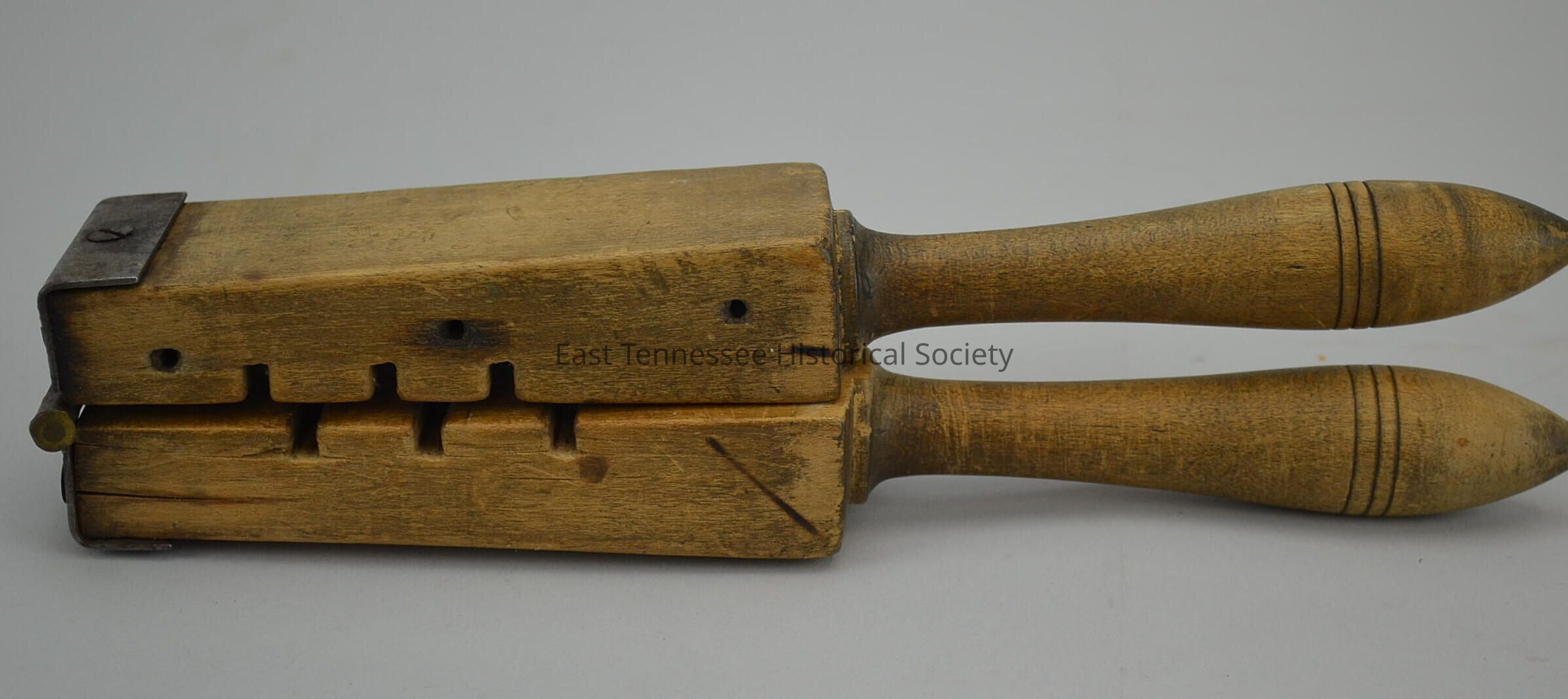 Fruit press juicer, wood (two pieces per half) and metal, one side 10 5/8"l, tapers from almost 1/8" thick at hinge to 1" at other end, handle same piece of wood turned on lathe/round tapering to larger with three lines cut in then tapering to point, three furrows cut in juicer block/first about 1" from hinge/others about 1/2" apart, metal hinge bends to attach to top with screws, handmade, 11"h x 2"w x 2 1/2"d, late 19th-early 20th century.Made/Created