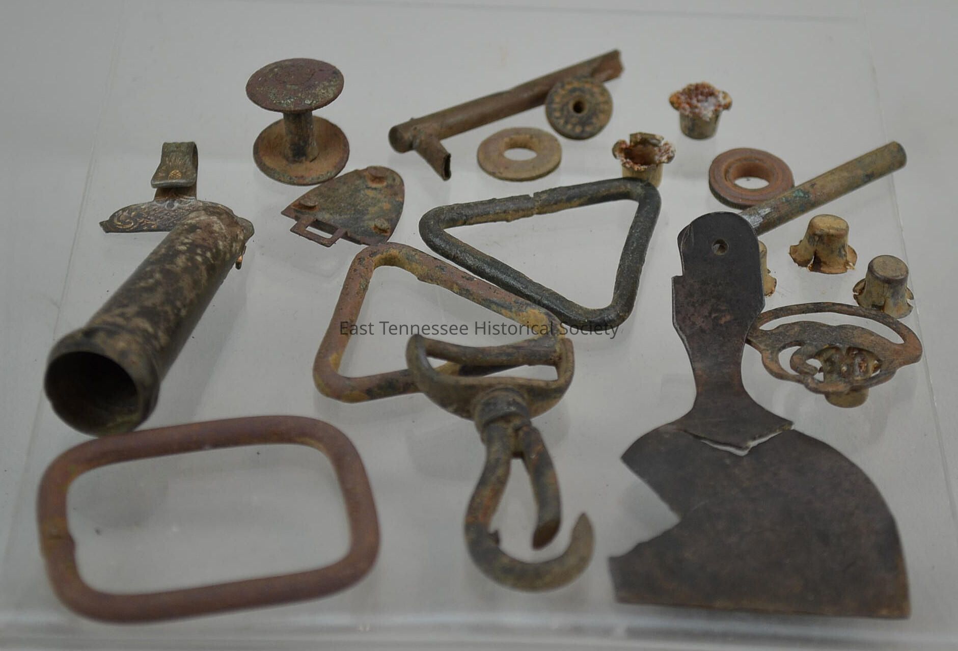 Assorted excavated items including persuccion caps, knapsack triangle buckles, rectangle buckle, clip for gunner's haversack, unidentifiable buckles and hooks, friction primers (one missing twisted metal pin), spoon attachment, knapsack buttons and unidentifiable tube; metal; various sizes, possibly Civil War era/1861-1865.