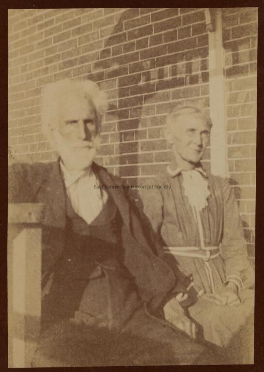 Photograph of an elderly Samuel Mayes Arnell and wife Cornelia sitting by a brick structure, c. 1900.Made/Created