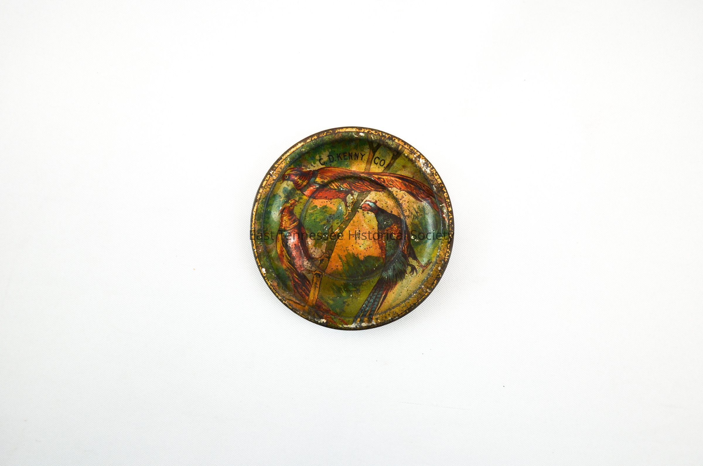 Saucer, lithoed tin, slightly scooped metal in gold tones for base color, marked "C D KENNY CO.," decorated on obverse with two colorful (primarily red with green and gold) ornamental birds on a tree limb with male pheasant looking at them from below, 5/8"h x 3 3/4" diam., 1891-1925?Made/Created