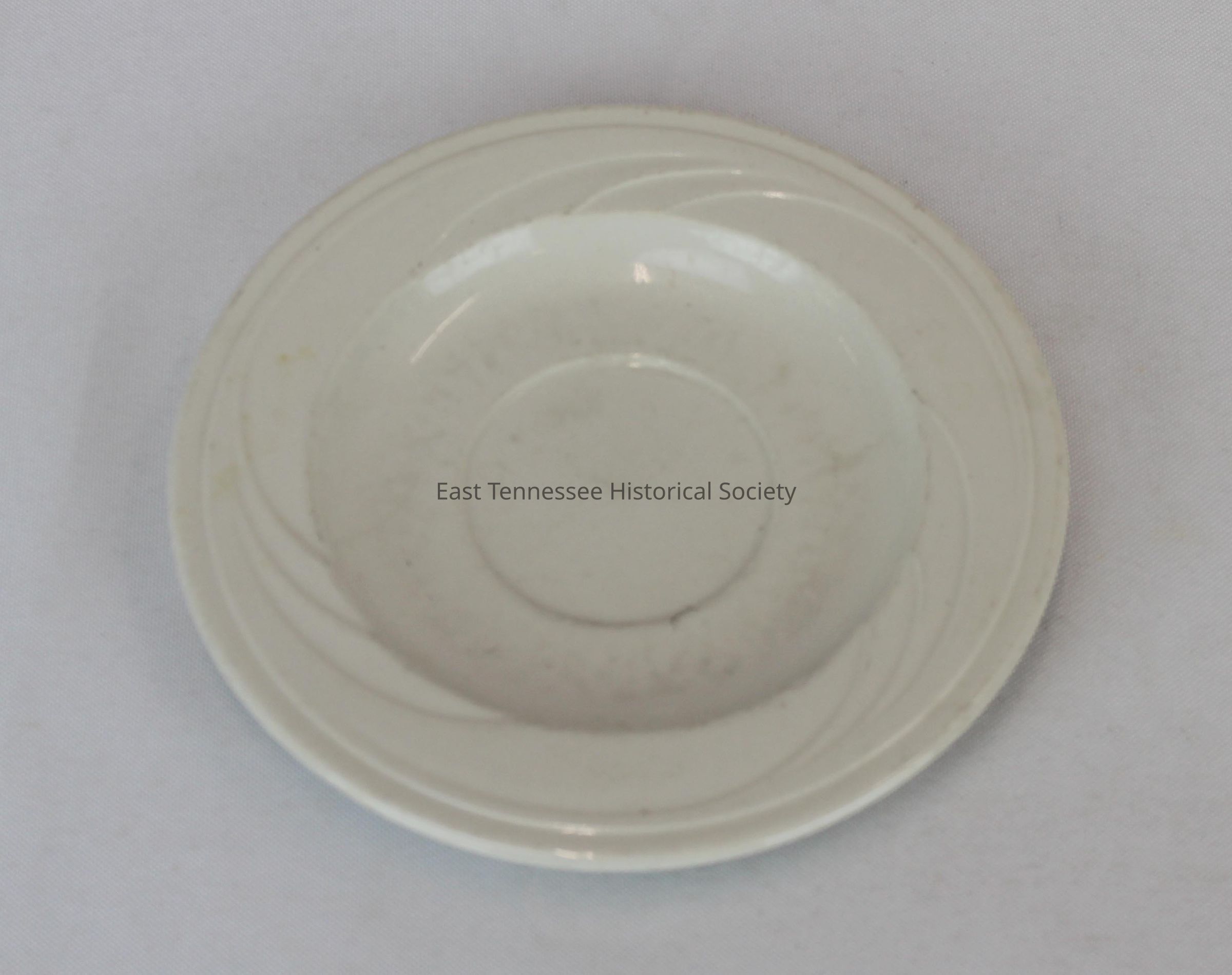 b) Saucer used at Regas Restaurant, cream ceramic with swirl design on rim, Syracuse China, 1/2"h x 5 3/4" diam.