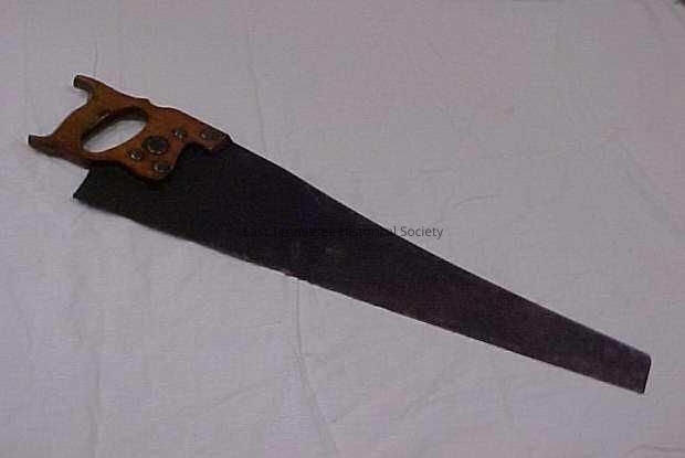 Crosscut saw with wooden handle and a fine tooth blade. Five brass colored screws hold handle in place. On right side of handle is a manufactures seal marked "H. DISSTON & SONS/ PHILADA". Slit at top and side of handle to accommodate blade, blade may have been replaceable.Collection