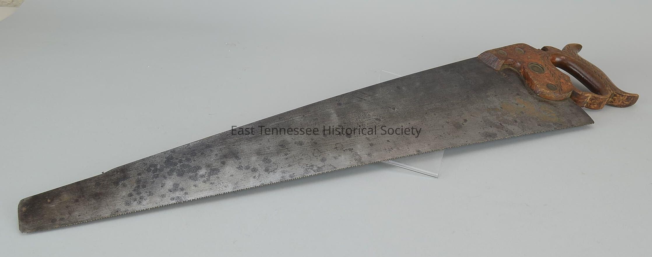 Hand saw #12, tapered blade with cross-cut teeth, ribbon top edge with nib 3 3/4" from end, extremely fine teeth/12 teeth/inch, marked medallion, "London Spring," "Refined/Patented/???," Disston & Sons (Philadelphia), apple wood finger-hold handle [might help date] with wheat design on front side, Social Security number "415321867" below right side handle, held to blade with four large brass screws/one attached to "H. Disston" medallion, Disston & Sons (Philadelphia)/Keystone Saw Works, 6 5/8"h x 30 5/8"l, pre-1900/probably c.1895.