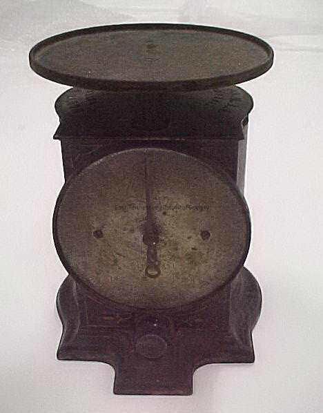 Milk scale from the Indian Summer Jersey Farm of Oscar McKamey, round disk fitted onto shaft that lowers into the body of scale when object placed on top, black metal with gold stripe detailing on sides, front dial has movable pointer, dial marked O to 19 and stamped "U.S. SCALE" and "PAT'D 1877," knob below adjusts pointer, cylinder top marked "NORTH BROS.M'F'G. CO. PHILA. PA. U.S.A./ PATENT NOV. 6, 1877, JUNE 29, 1881" in raised lettering, interior structure can be seen from base, 9 1/2"h x 7"w x 7 1/4"d, used on farm prior to WWII, most likely by 1930s/1892?-1920?Made/Created