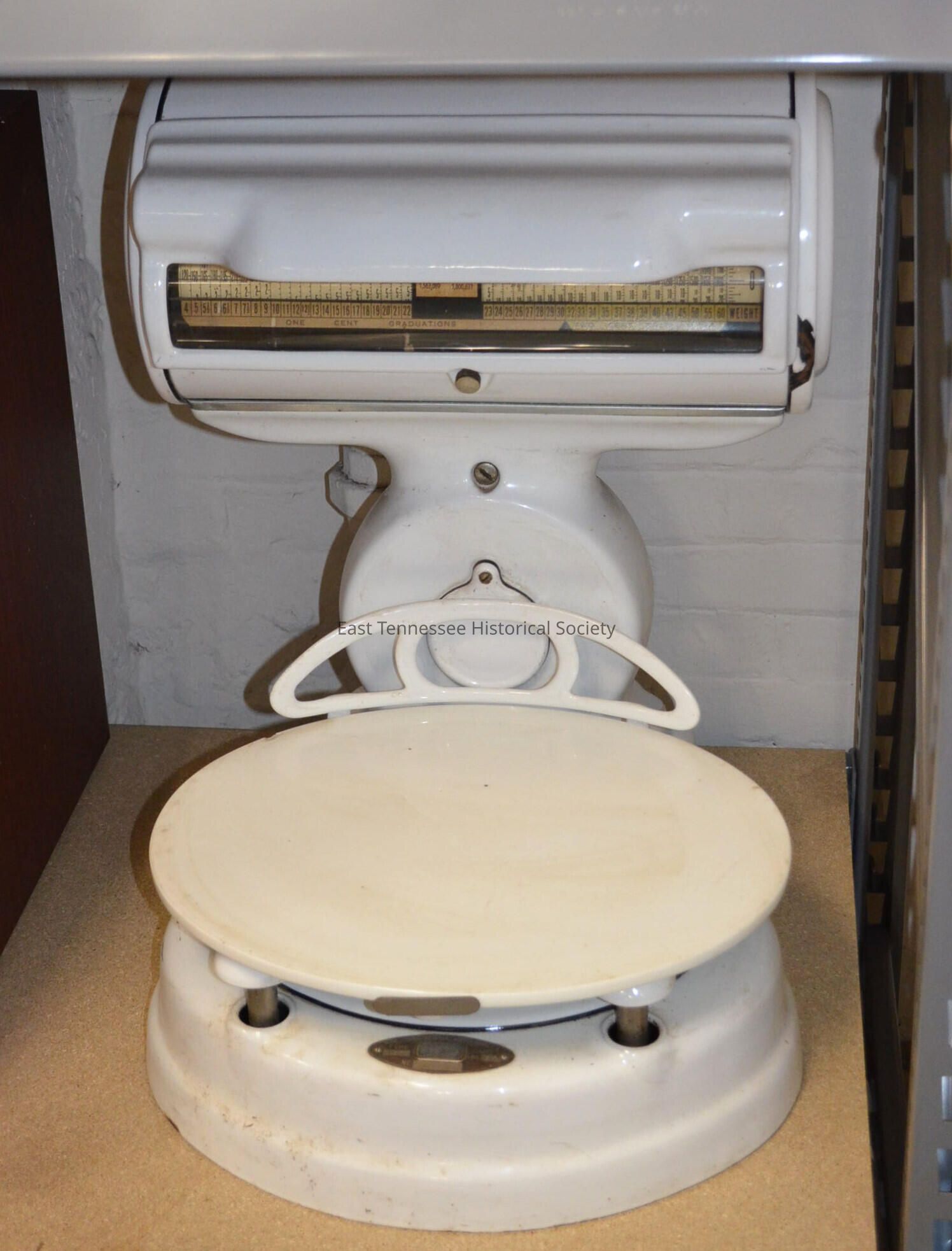 Produce scale, white porcelain, with all pans and weighing devises, 24"h x 18"w x 23"d, 1940s.Made/Created