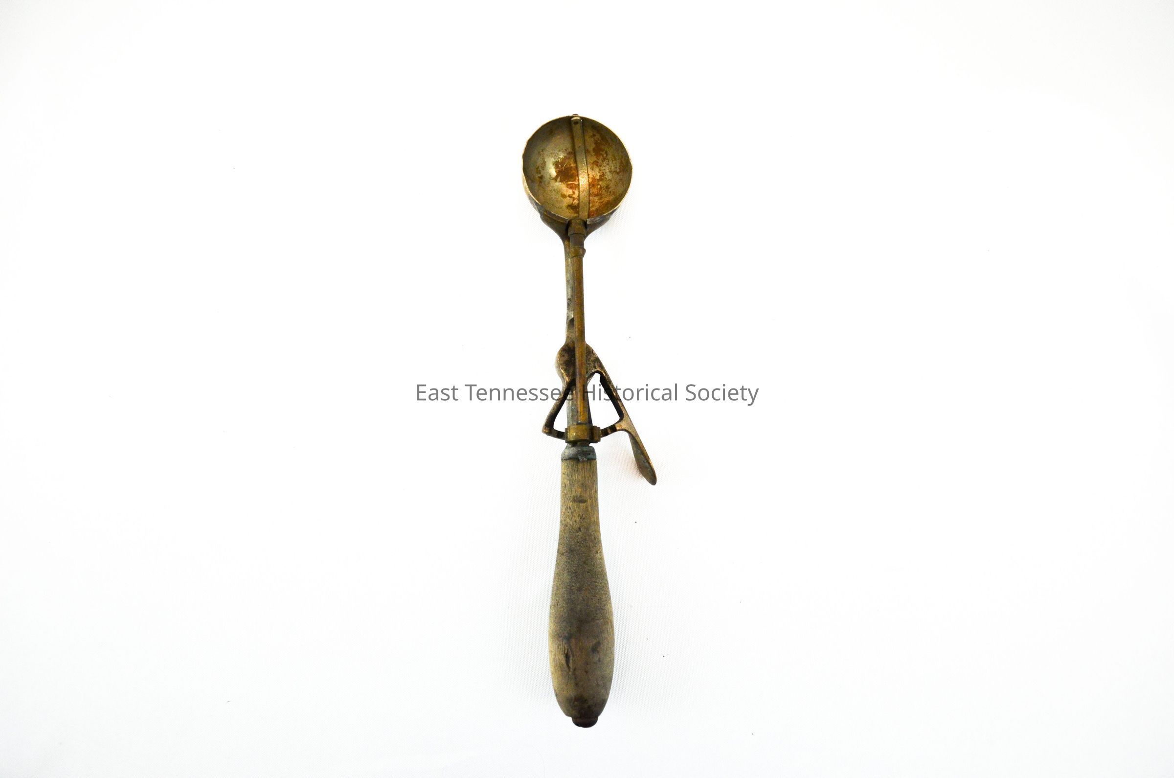 Scoop used at the Liberty Ice Cream Company, wooden handle with thumb lever to release ice cream, Gilchrist, c. 1930*.