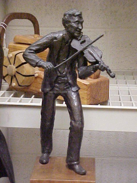 Roy Acuff figurine, bronze on rectangular natural-stain wood base, depicts smiling man playing fiddle--wears jacket with pockets/tie/belt, holds bow in right hand/left foot forward ,figure 11"h x 6 1/2"w x 5"d, base-7"h x 4 1/2" square.Collection