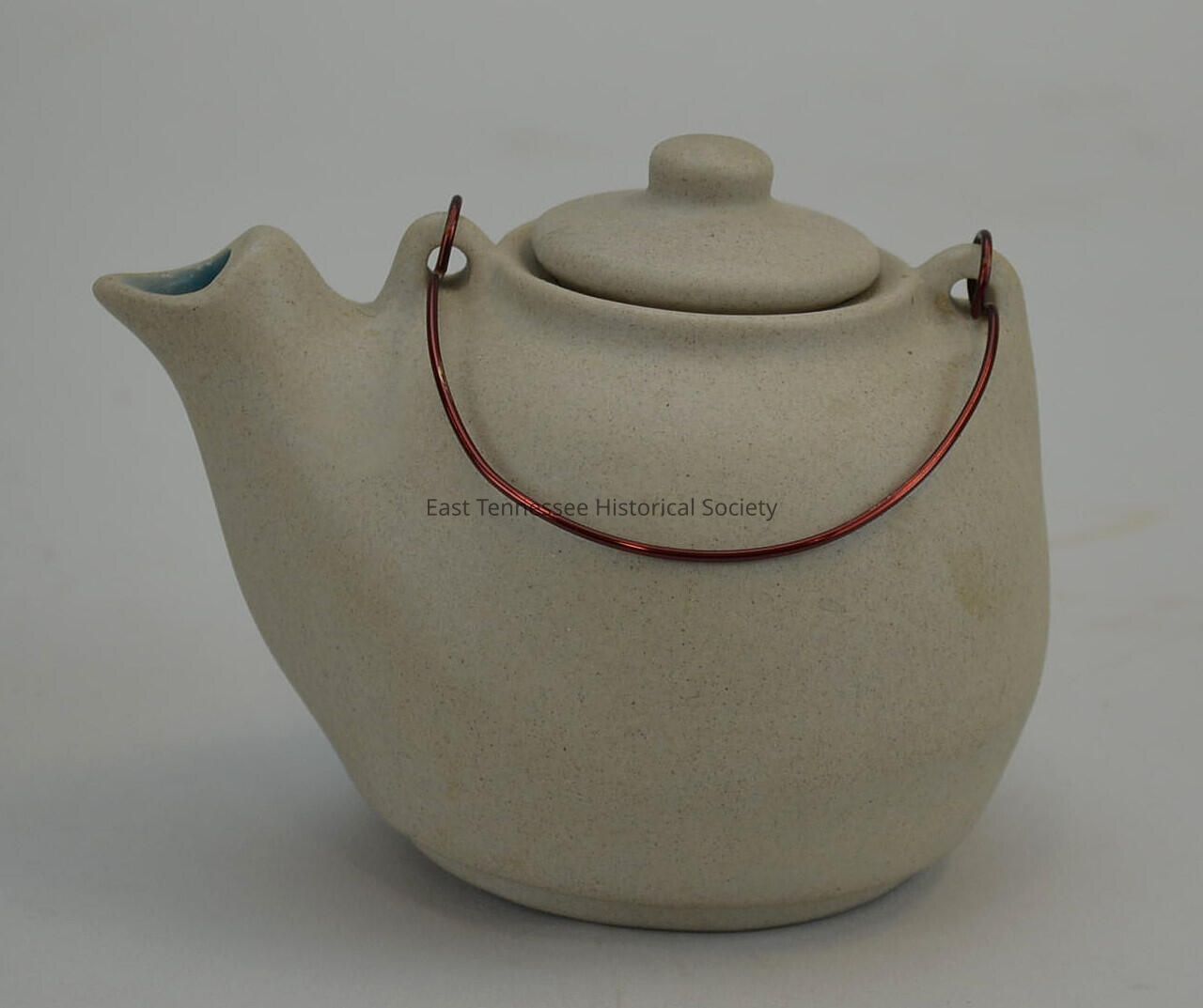 a) Tea set - teapot, matte beige ceramic with glossy glazed aqua interior, copper wire handle, based stamped "The Pigeon Forge Pottery" in black script, 5 3/8"h x 5 1/2"w x 4 1/4"d, late 1950s-early 1960s.