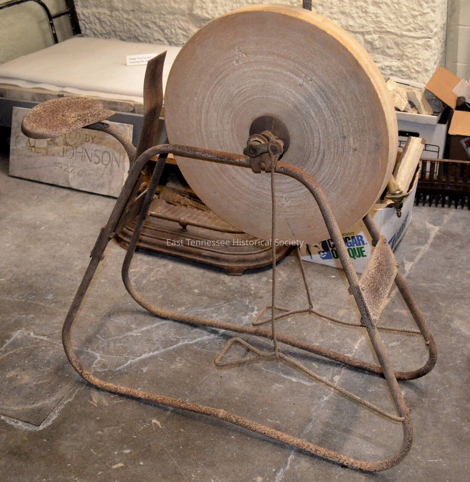 Blade sharpener, metal frame with stone/cement wheel, seat and pumping foot pedals mounted on runners, stone wheel attached at front with metal cone mounted above to hold water or oil to keep wheel wet/lubricated, maker unknown, 46 1/2"h x 13"w x 47"d, date unknown/pre-1950. Used to sharpen a variety of farm implements: mower blades, axes, scythes, sickles, knives.Made/Created