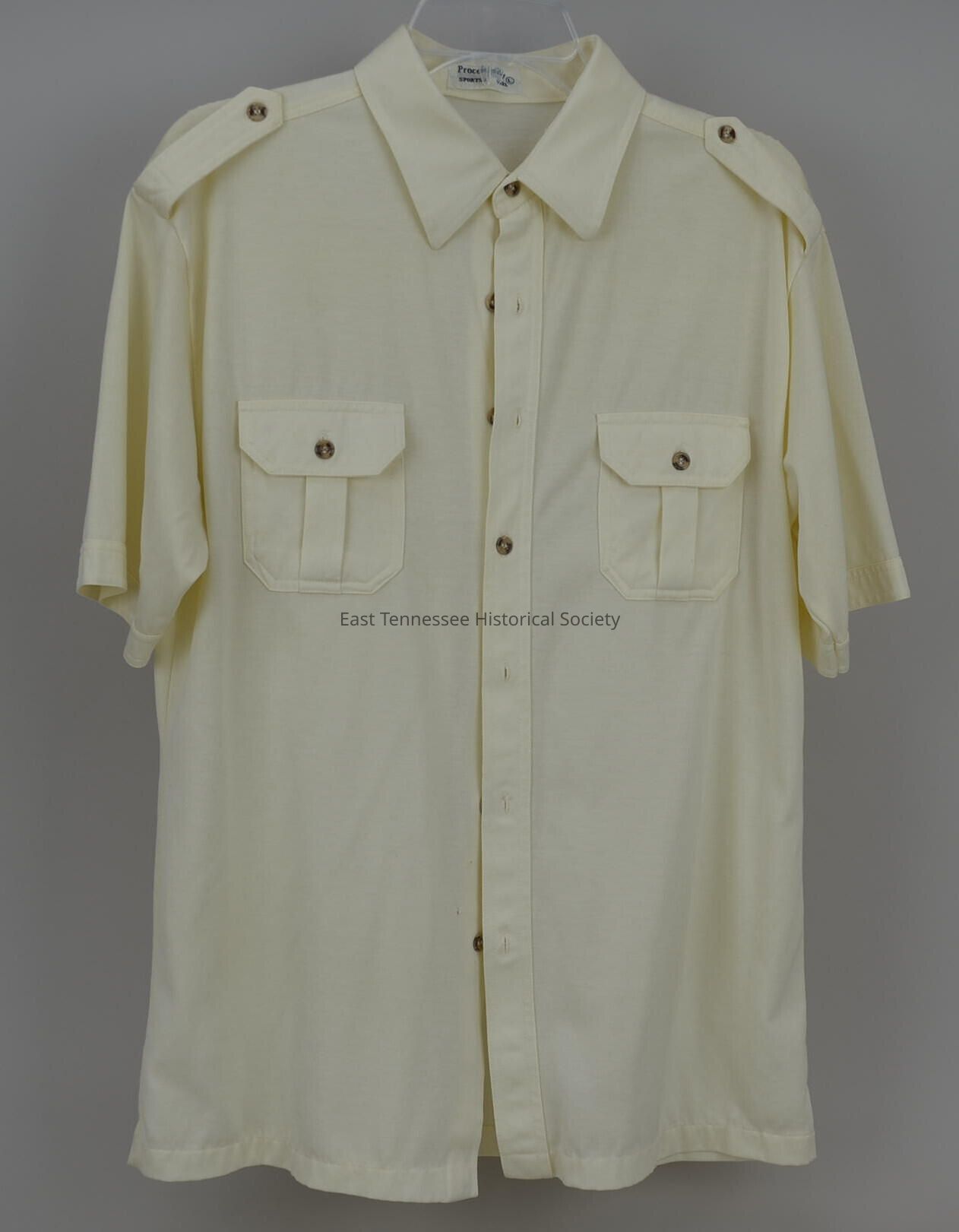 Shirt/part of performance costume of George Riddle, cream polyester (75%) and cotton (25%) knit, short sleeve with shoulder eqaulets, two breast pockets with pleated patch flaps with buttons, tortoise-colored plastic-button front closure, "Procelebrity Sports Apparel" (Taiwan) label, large, 31"h x 19"w at shoulders, c. 1995.Made/Created