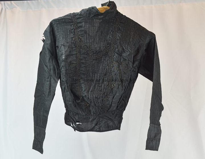 Shirtwaist, Early 20th Century/Edwardian (?), black, size 34 waist shirt with flowy embroidery with black thread, belonged to Edith Hazel Renow/ McDaniel (1894-1945).Dimensions