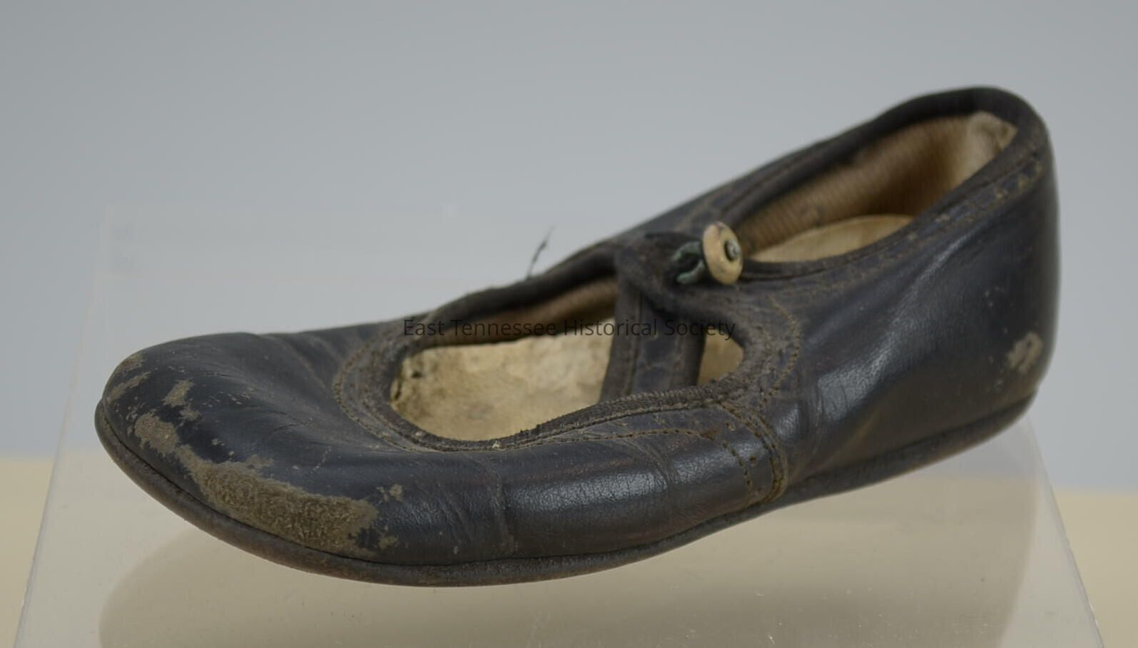 Pair of child's shoes of Hazel Leone Kinsland, black leather, square-toe Mary Jane style with round vamp, perforated trim all around toe opening and straps, buttons to outside with metal shank ceramic button, white cloth lining, faux-leather insole, one-piece leather sole, numbers 363 68711 0103 stamped inside heel, unknown manufacturer (USA), c. 1900. a) Left b) RightMade/Created
