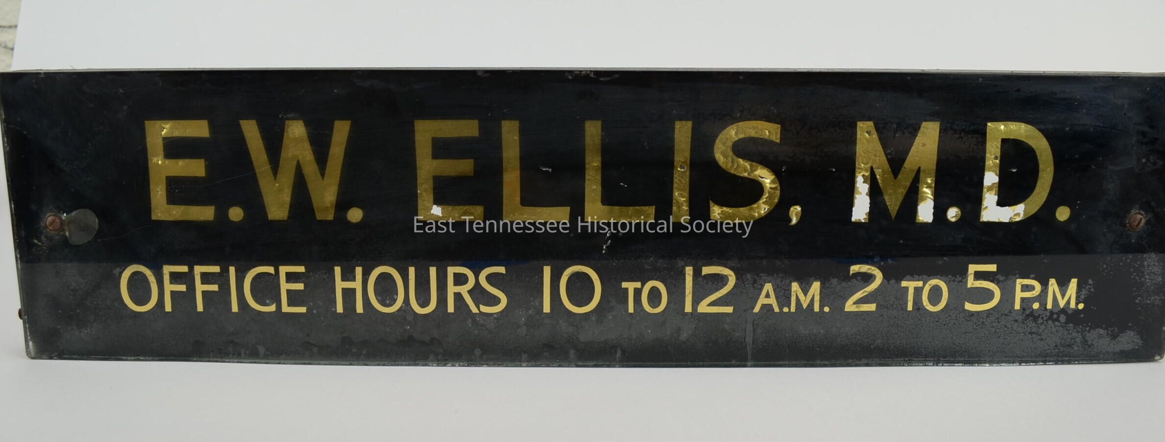 Business sign for Knoxville medical practice of Edward Woodrow Ellis M.D., plastic/wood/foil/metal, marked "E. W. ELLIS, M.D. / OFFICE HOURS 10 TO 12 A.M. 2 TO 5 P.M." in gold foil with black background, clear plastic cover mounted to black-painted wood backing with screw at either front end, rectangular opening through center reverse where lettering mounted, two screw holes at either end/side, 6"h x 24"w x 1" d, 1949 or after.Made/Created