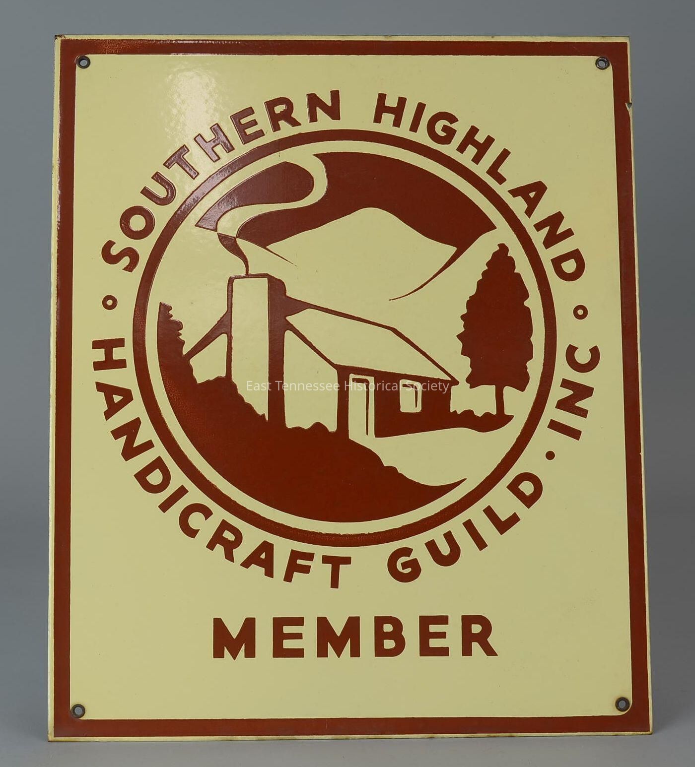 Sign, rectangular metal, cream porcelain obverse with burnt-sienna border/lettering/image details/silver reverse, marked "SOUTHERN HIGHLAND HANDICRAFT GUILD / MEMBER," shows logo of cabin with smoking chimney/evergreen tree/mountains, hanging holes in corners, 18"h x 15"w, date unknown (name changed to Southern Highland Craft Guild in 1990s).Dimensions