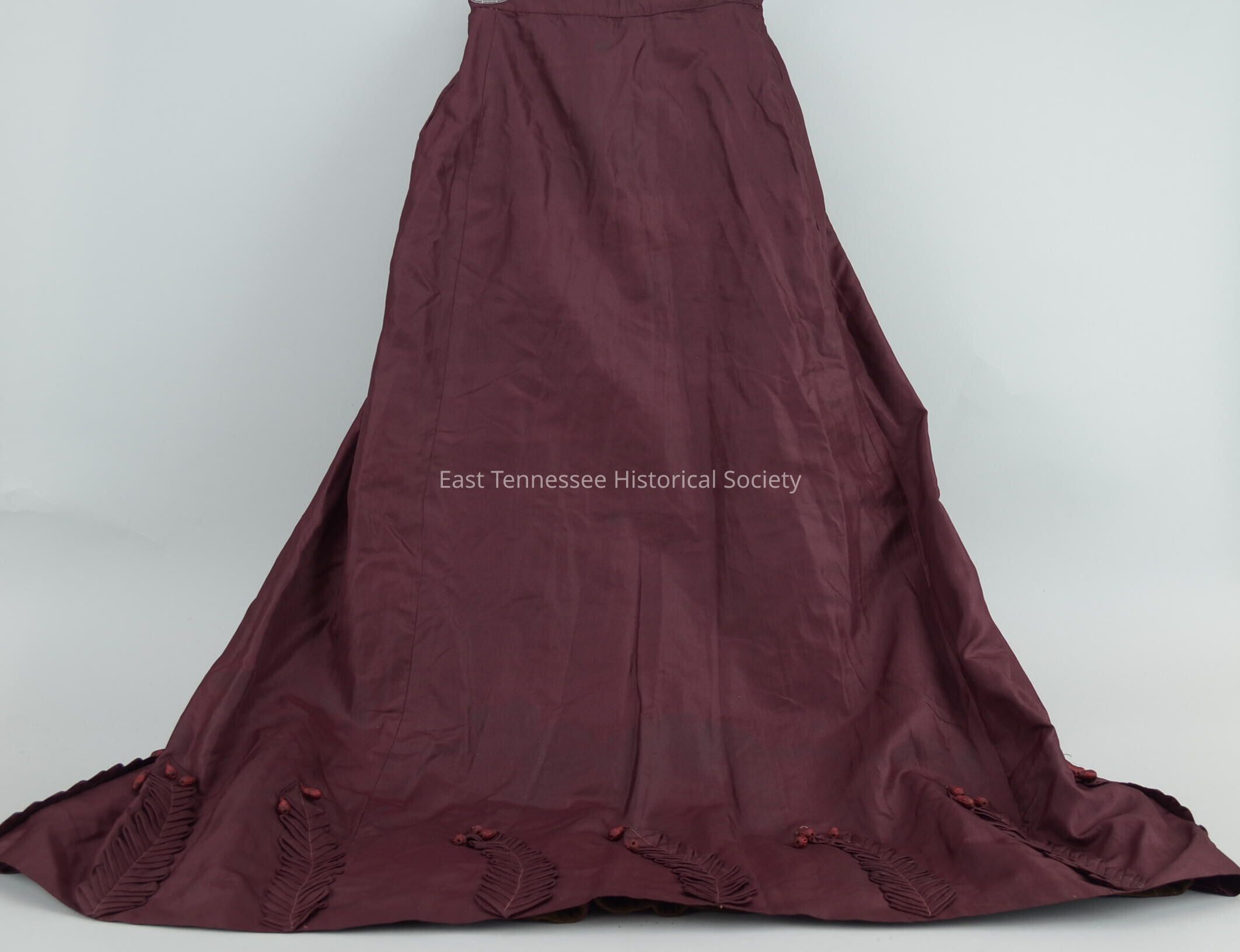 b) Flared skirt (of two-piece dress), nine self fabric leaf designs with three teardrop tassels at top/scattered around front and sides of skirt, back closure with hook and eye and decorative covered buttons and braid frogs, triangle-shape gusset set in below back opening, back longer than front, lined with brown cotton, black buckrum and velvet added to hem of lining for stiffness and weight, maker unknown/handmade, 22 1/2"h x 12"w, 1892.Made/Created