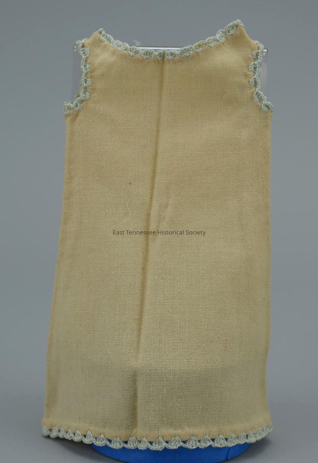 Doll slip made (by tradition) by Margaret Cecil Peak Bundren, white (originally) cotton with baby-blue crochet edging at neck/armholes/hem, scoop neck, back closure with ribbon tie, hand sewn with French seams, 8 1/2"h x 4", c. 1911.Made/Created