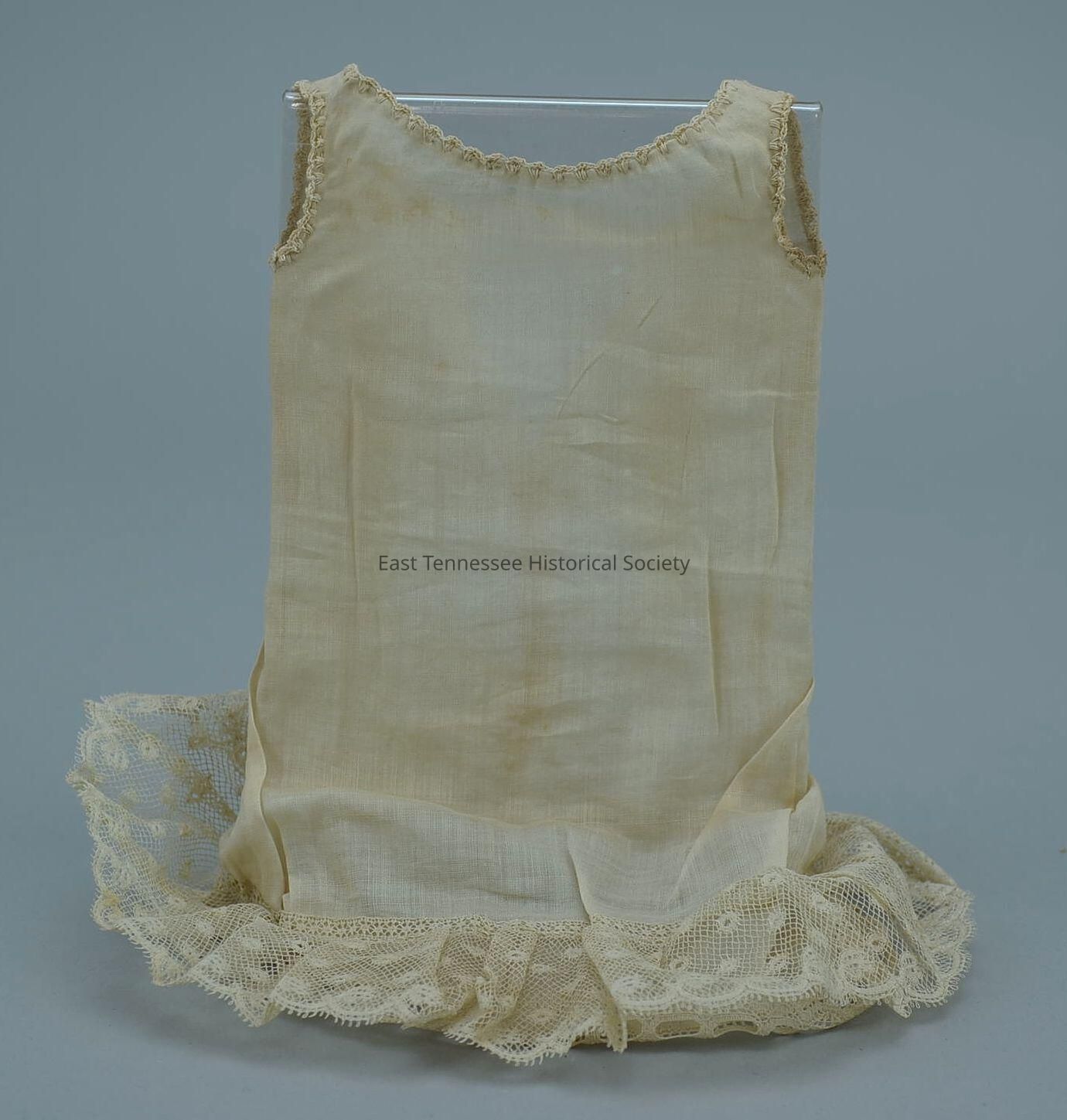 .3) Same fabric slip with crochet at neck and armholes made (per tradition) by Margaret Cecil Peak Bundren, one button back closure, lace at hem with 1 1/4" lace ruffle over that, 6"h x 4"w, c. 1911.Made/Created