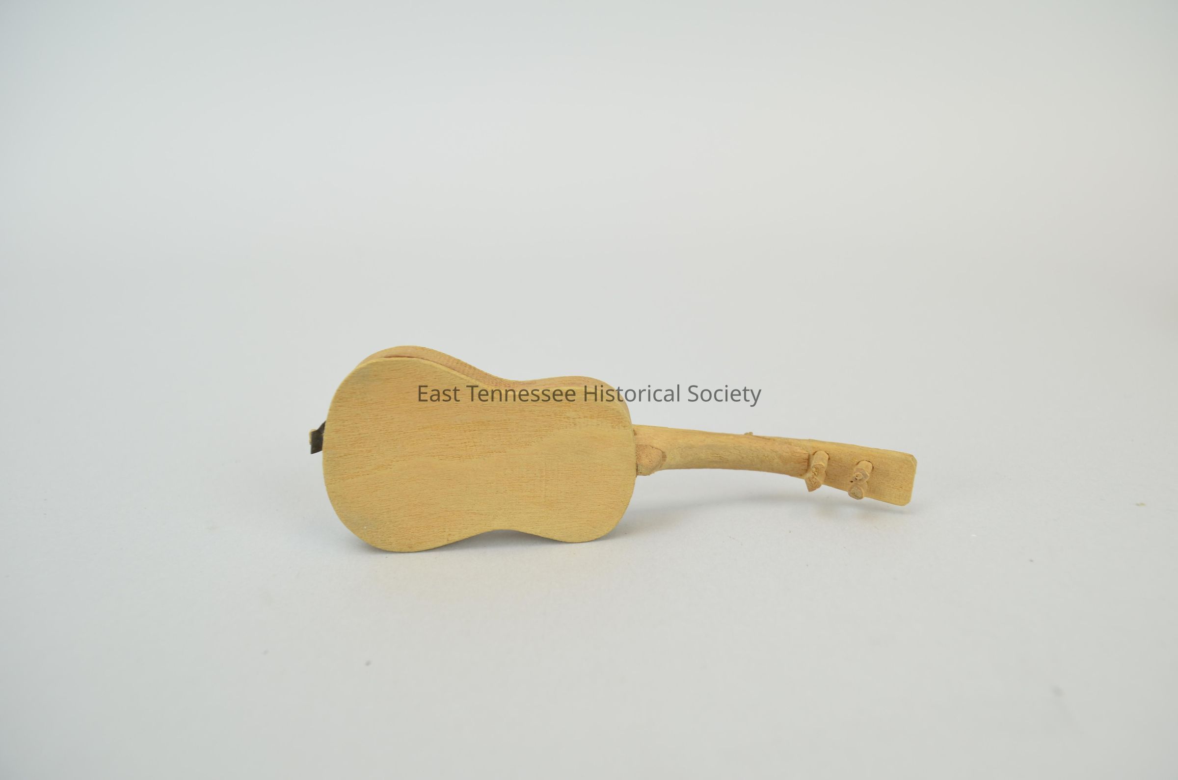 Folk art hand made miniature guitar souvenir, pencil-marked border around the border of the top of the body, pencil-marked border and dotted design around the soundhole, horizontal lines carved along the fingerboard / fretboard to indicate position markers, four strings made of metal that extend from the turning key pegs to a tailpiece attached to a wooden peg at the base of the body. Body 2 1/8"h x 1 3/8"w (1"w at waist) x 3/8"d. Fingerboard and headstock 2 7/8"h x 3/8"w.Dimensions
