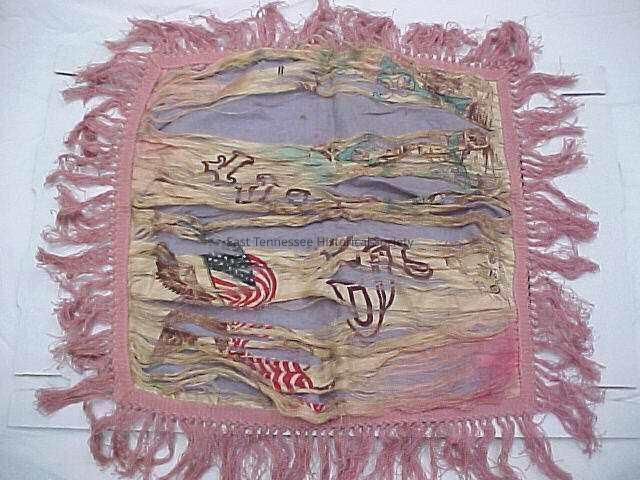 Military souvenir "mother" pillow cover of Adeline Shields, 16" x 18"w leaded silk front bearing Army symbols (bald eagle carrying American flag, "To Do"), purplish gray backing, 23 1/2"h x 24"w including fringe, 1917-1918/World War I.Dimensions
