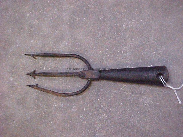 Frog gigger used in Cades Cove by Shields?/Chambers families, metal, three barbed tines, hole, at base, back split part way to fit over handle, early 20th century/1900?-1925.Dimensions
