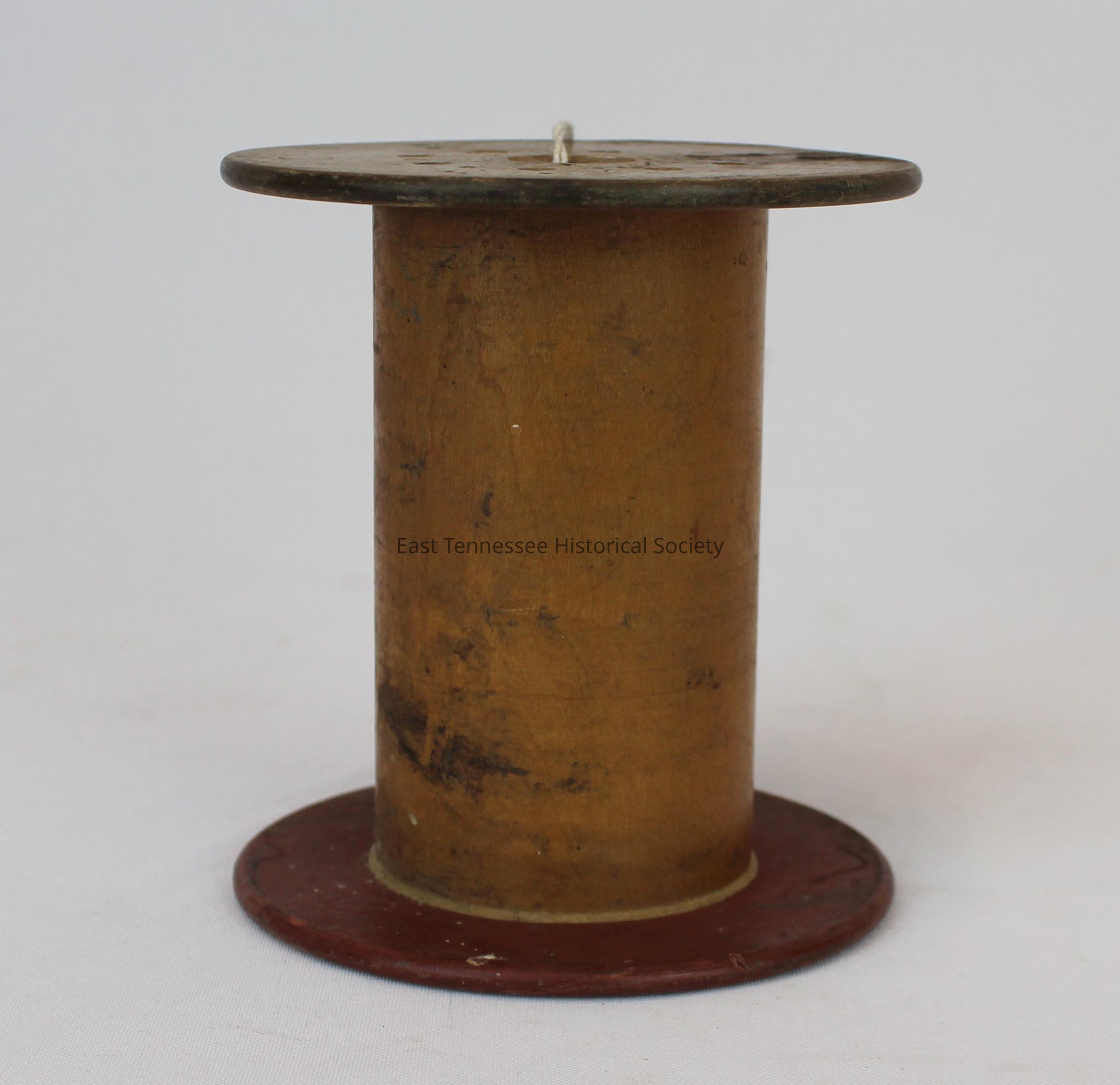 Wooden spindle from American Enka, there are three different colors of wood (one end is red, the middle is tan, and the other end is brown), there is a hole at each end that is a hollow line through the spindle, each end has eight nail heads visible, on the red end there is a small circle (1 cm) next to the hole, on the brown end the numbers "6" and "49" are imprinted between nail heads on either side of the hole, 5 1/2"h x 4 3/4" diam.