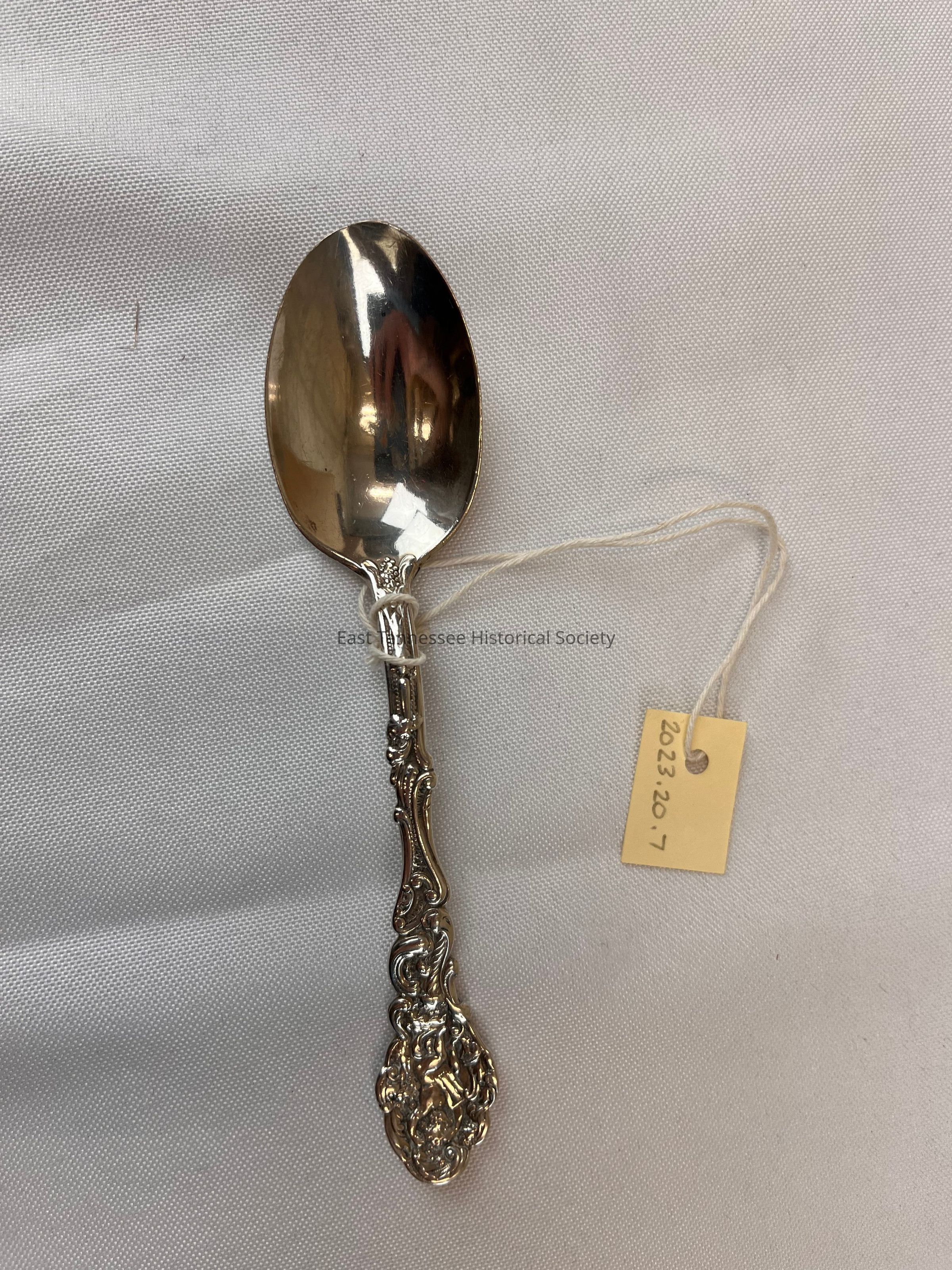 Gorham Silver, "Versailles" 1888, Silver Spoon. Silver spoon with floral details and naked male figure, engraved "EMcCG" on handle.
