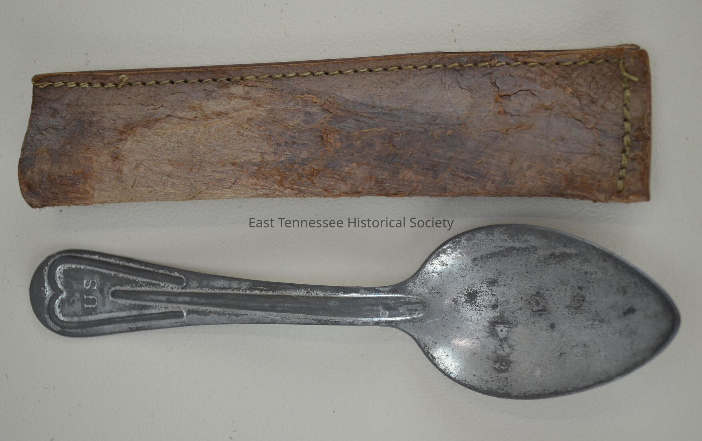 a) Mess kit spoon (military issue) belonging to Robert Barnes "Bob" LaForge Jr. (1885-1956), metal/tin plated steel or iron, M-1910 pattern, marked "US" at handle end top, marked "WB" over "B/1917" on reverse, manufactured by Wallace Brothers Company, 7 3/8"h x 1 3/4"w, WWI/1917.