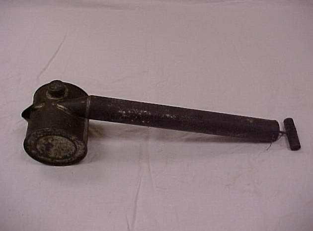 Bug sprayer made from large metal can tied perpendicular to a narrow metal tube. Two small spouts come out of the can, below spouts is a small, triangular collection trough. Can has a metal cap which unscrews to insert pesticide. End of tube that is not fixed to can has a wooden stopper screwed into the back. A small hole at back of tube allows air in. When a metal pump with a wooden handle was utilized at the back of the tube air was pumped into the can and the pesticide could be released as an aerosol. Small metal washer between pump and wooden backing. Piece of twine attached to wooden handle.Collection