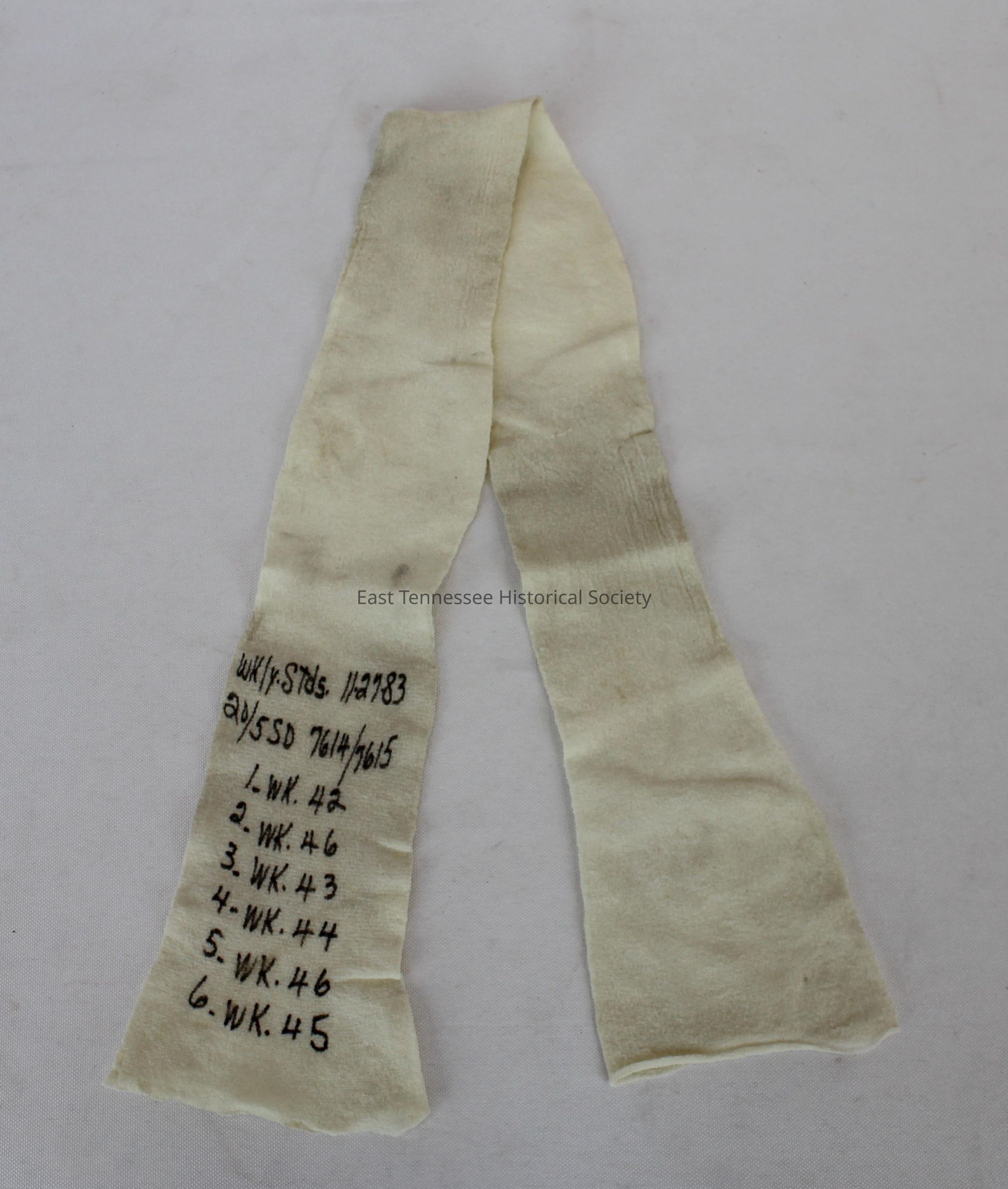Cream-colored piece of seamless stocking with letters and numbers written in permanent ink, used as production standard at American Enka Lowland facility, 26"l x 3"w, 1983.